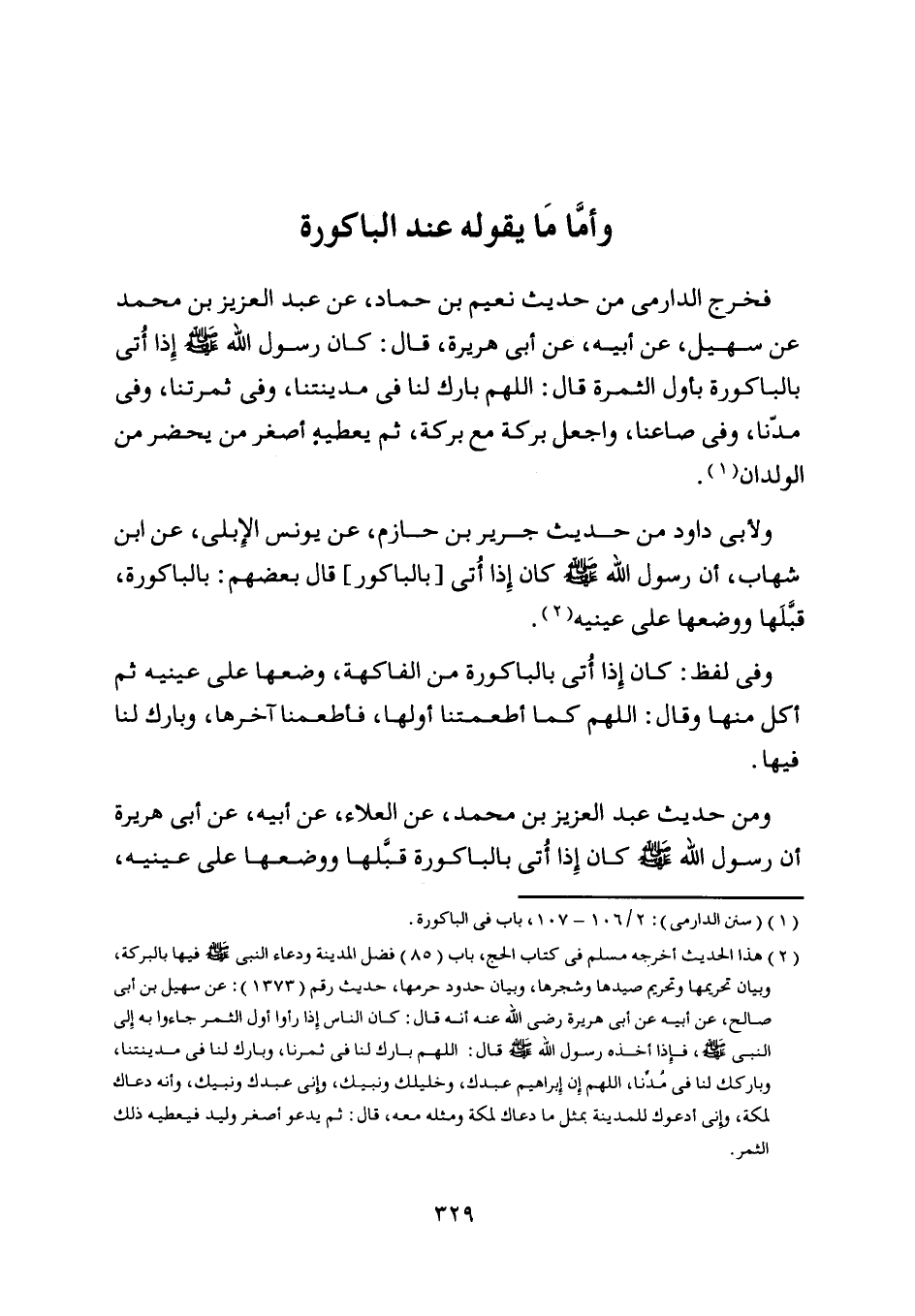 فخرج الدارميّ من حديث نعيم بن حماد، عن عبد العزيز بن محمد عن سهيل، عن أبيه، عن أبى هريرة، قال: كان رسول اللَّه صلى اللَّه عليه وسلم إذا أتى بالباكورة بأول الثمرة قال: اللَّهمّ بارك لنا في مدينتنا، وفي ثمرتنا، وفي مدّنا، وفي صاعنا، واجعل بركة مع بركة، ثم يعطيه أصغر من يحضر من الولدان [ (1) ] .