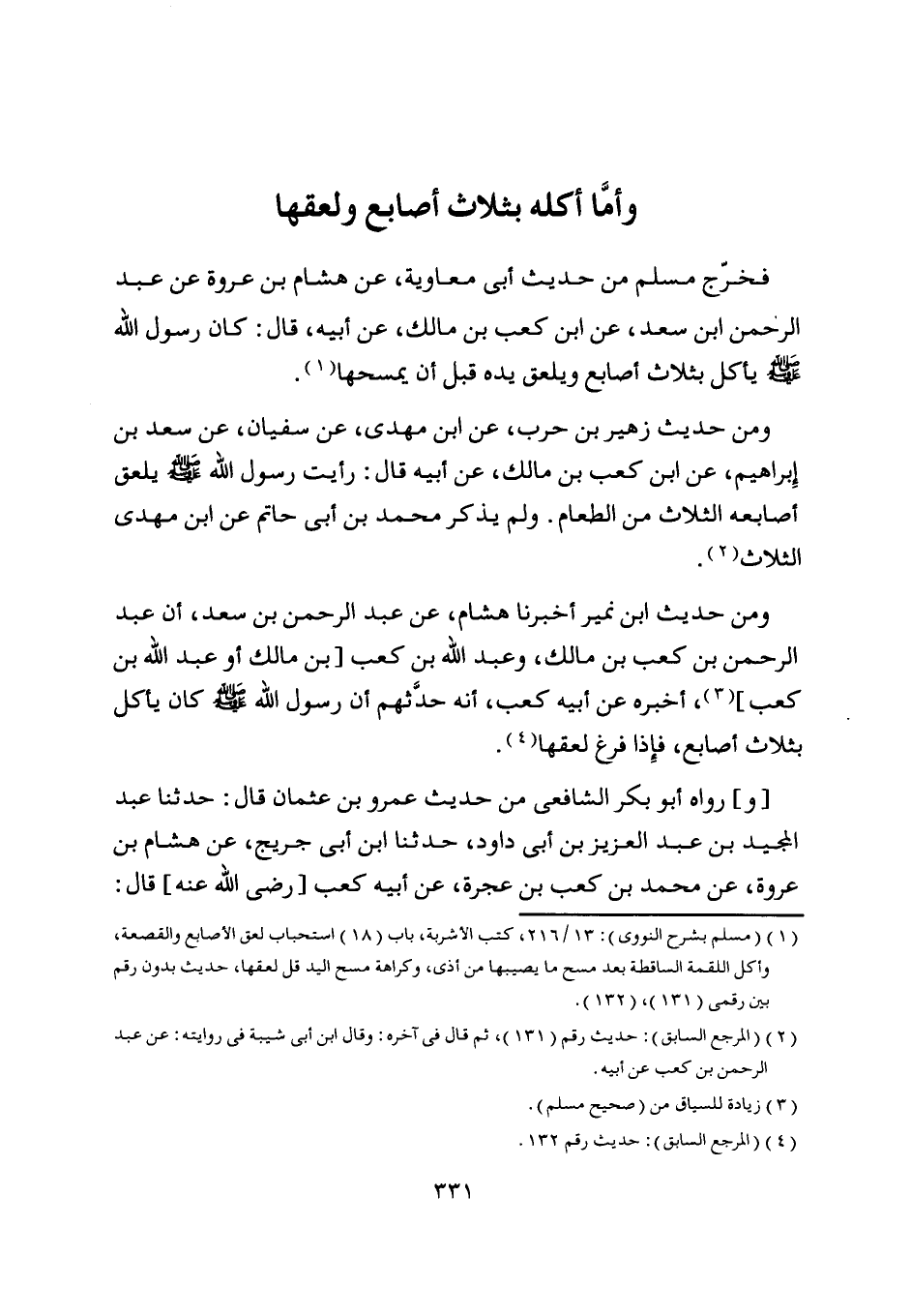 ومن حديث ابن نمير أخبرنا هشام، عن عبد الرحمن بن سعد، أن عبد الرحمن بن كعب بن مالك، وعبد اللَّه بن كعب [بن مالك أو عبد اللَّه بن كعب] [ (3) ] ، أخبره عن أبيه كعب، أنه حدّثهم أن رسول اللَّه صلى اللَّه عليه وسلم كان يأكل بثلاث أصابع، فإذا فرغ لعقها [ (4) ] .