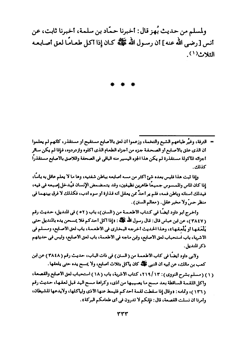 ولمسلم من حديث بهز قال: أخبرنا حمّاد بن سلمة، أخبرنا ثابت، عن أنس [رضى اللَّه عنه] أن رسول اللَّه صلى اللَّه عليه وسلم كان إذا أكل طعاما لعق أصابعه الثلاث [ (1) ] .