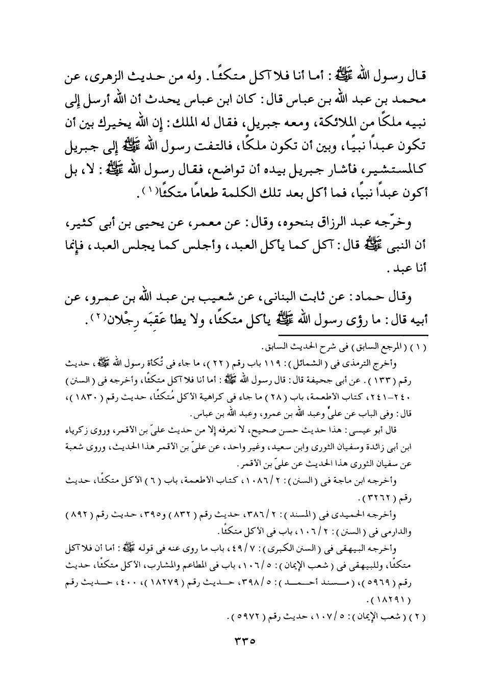 وأخرج الترمذي في (الشمائل) : 119 باب رقم (22) ، ما جاء في تكأة رسول اللَّه صلى اللَّه عليه وسلم، حديث رقم (133) . عن أبى جحيفة قال: قال رسول اللَّه صلى اللَّه عليه وسلم: أما أنا فلا آكل متكئا، وأخرجه في (السنن) 240- 241، كتاب الأطعمة، باب (28) ما جاء في كراهية الأكل متكئا، حديث رقم (1830) ، قال: وفي الباب عن عليّ وعبد اللَّه بن عمرو، وعبد اللَّه بن عباس.