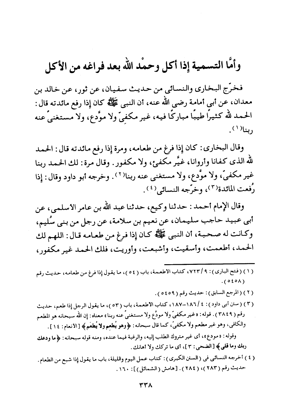 فخرّج البخاري والنسائي من حديث سفيان، عن ثور، عن خالد بن معدان، عن أبى أمامة رضى اللَّه عنه، أن النبي صلى اللَّه عليه وسلم كان إذا رفع مائدته قال: