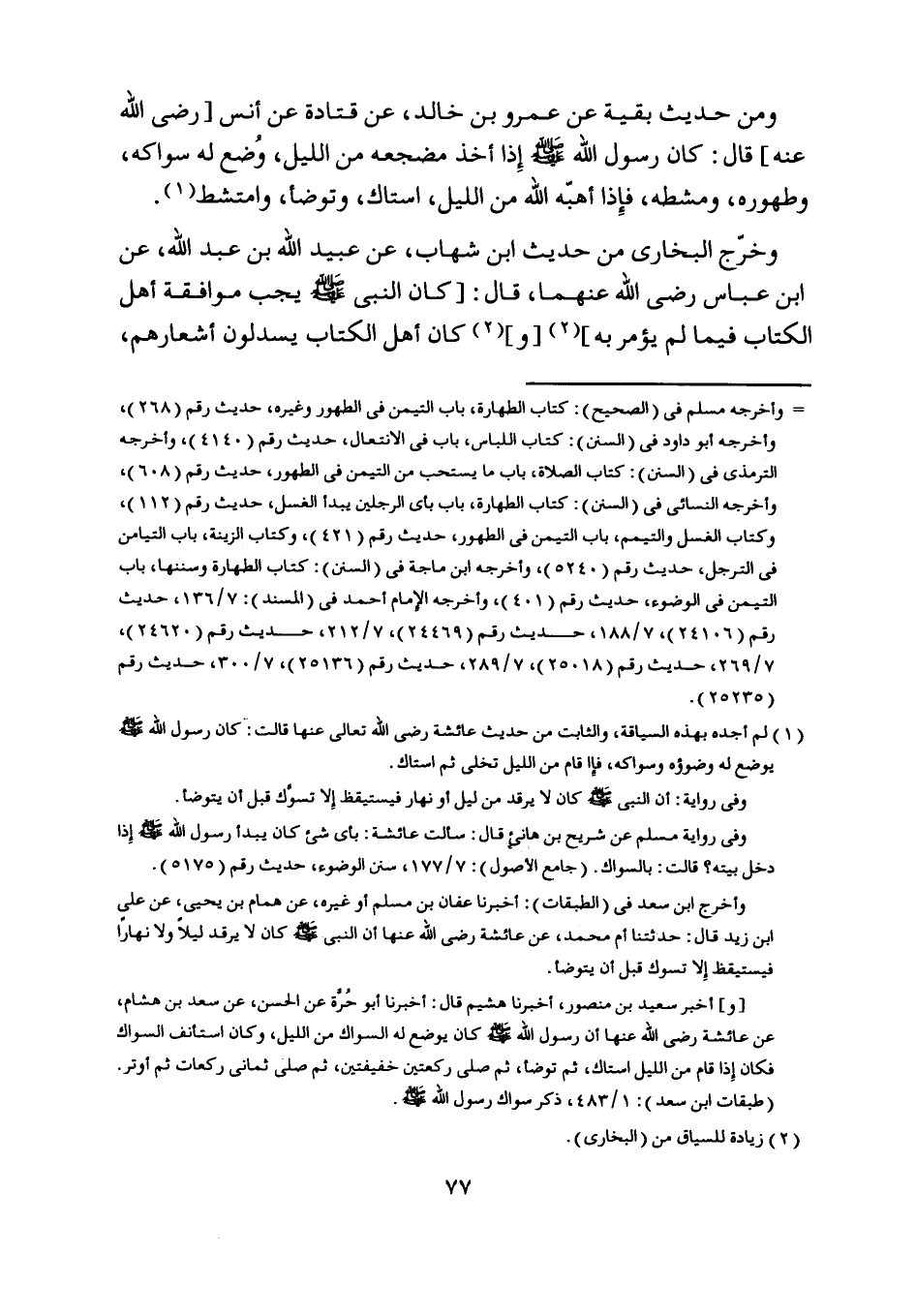 وأخرج ابن سعد في (الطبقات) : أخبرنا عفان بن مسلم أو غيره، عن همام بن يحيى، عن على ابن زيد قال: حدثتنا أم محمد، عن عائشة رضى اللَّه عنها أن النبي صلى اللَّه عليه وسلم كان لا يرقد ليلا ولا نهارا فيستيقظ إلا تسوك قبل أن يتوضأ.