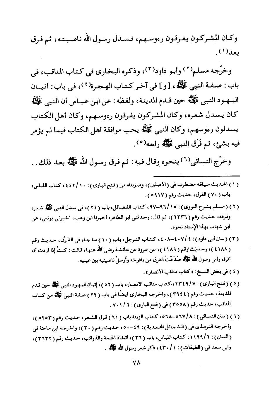 [ (6) ] (سنن النسائي) : 8/ 567- 568، كتاب الزينة باب (61) فرق الشعر، حديث رقم (5253) ، وأخرجه الترمذي في (الشمائل المحمدية) : 49- 50، حديث رقم (30) ، وأخرجه ابن ماجة في (السنن) : 2/ 1199، كتاب اللباس، باب (36) ، اتخاذ الجمة والذوائب، حديث رقم (3632) ، وابن سعد في (الطبقات) : 1/ 430، ذكر شعر رسول اللَّه صلى اللَّه عليه وسلم.