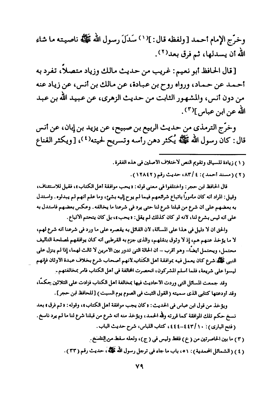 وخرّج الإمام أحمد [ولفظه قال:] [ (1) ] سدل رسول اللَّه صلى اللَّه عليه وسلم ناصيته ما شاء اللَّه أن يسدلها، ثم فرق بعد [ (2) ] .
