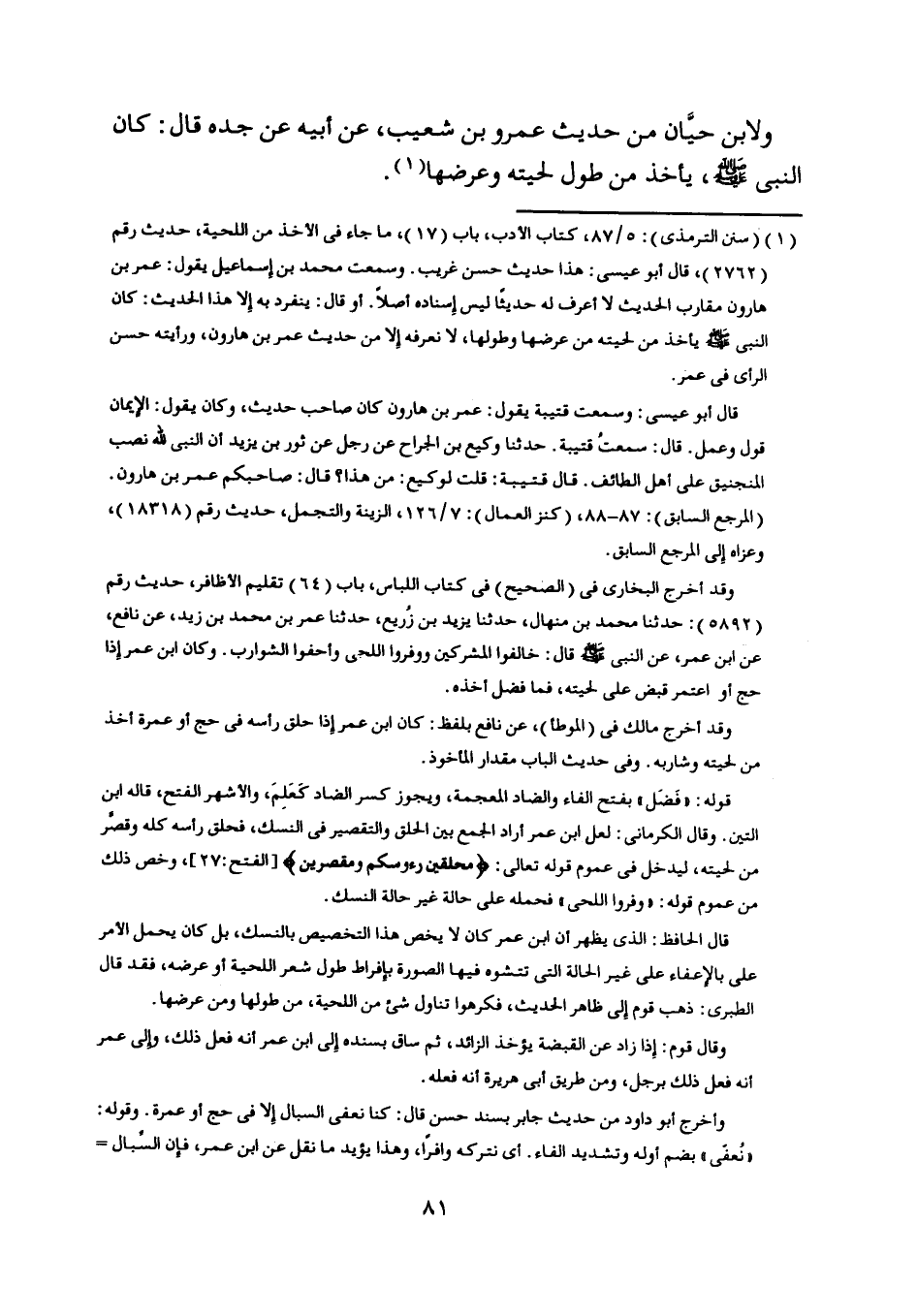 [ (1) ] (سنن الترمذي) : 5/ 87، كتاب الأدب، باب (17) ، ما جاء في الأخذ من اللحية، حديث رقم (2762) ، قال أبو عيسى: هذا حديث حسن غريب. وسمعت محمد بن إسماعيل يقول: عمر بن هارون مقارب الحديث لا أعرف له حديثا ليس إسناده أصلا. أو قال: ينفرد به إلا هذا الحديث: كان النبي صلى اللَّه عليه وسلم يأخذ من لحيته من عرضها وطولها، لا نعرفه إلا من حديث عمر بن هارون، ورأيته حسن الرأى في عمر.