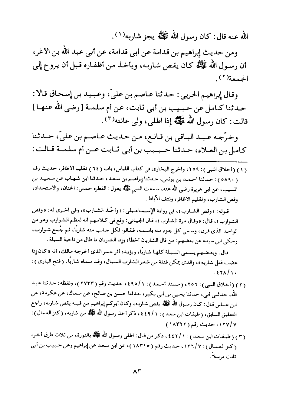 [ (2) ] (أخلاق النبي) : 256، (مسند أحمد) : 1/ 495، حديث رقم (2733) ، ولفظه: حدثنا عبد اللَّه، حدثني أبى، حدثنا يحيى بن أبى بكير، حدثنا حسن بن صالح، عن سماك، عن عكرمة، عن ابن عباس قال: كان رسول اللَّه صلى اللَّه عليه وسلم يقص شاربه، وكان أبوكم إبراهيم من قبله يقص شاربه، راجع التعليق السابق، (طبقات ابن سعد) : 1/ 449، ذكر أخذ رسول اللَّه صلى اللَّه عليه وسلم من شاربه، (كنز العمال) :