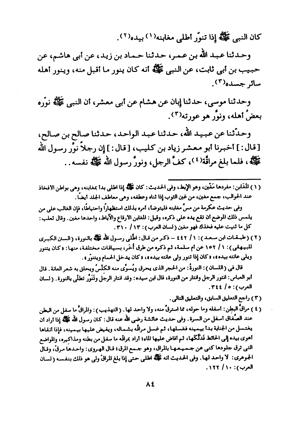 وحدثنا عبد اللَّه بن عمر، حدثنا حماد بن زيد، عن أبى هاشم، عن حبيب بن أبى ثابت، عن النبي صلى اللَّه عليه وسلم أنه كان ينور ما أقبل منه، وينور أهله سائر جسده [ (3) ] .