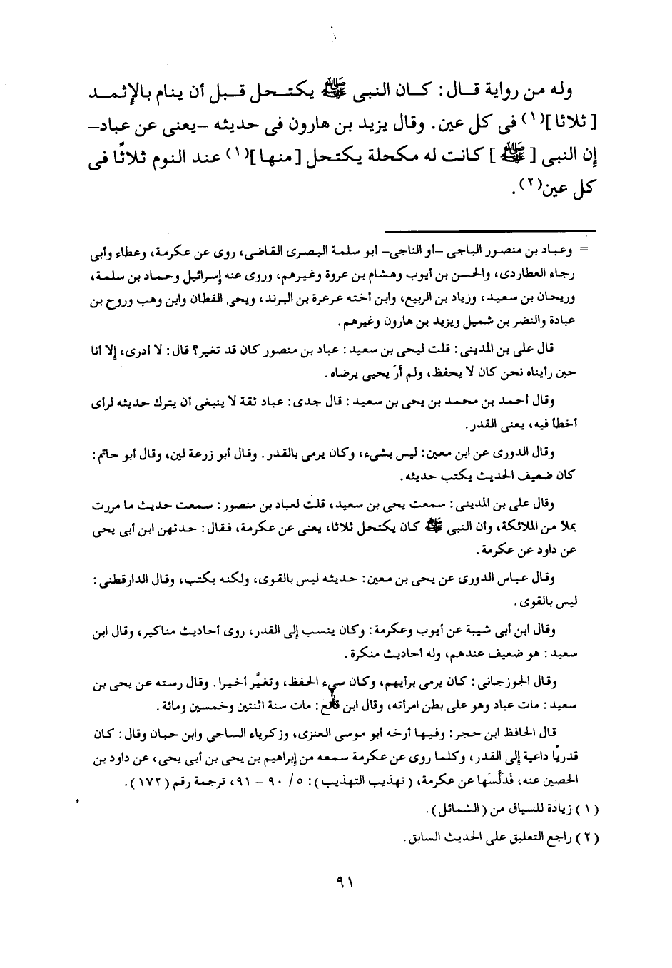 وله من رواية قال: كان النبي صلى اللَّه عليه وسلم يكتحل قبل أن ينام بالإثمد [ثلاثا] [ (1) ] في كل عين. وقال يزيد بن هارون في حديثه- يعنى عن عباد- إن النبي [صلى اللَّه عليه وسلم] كانت له مكحلة يكتحل [منها] [ (1) ] عند النوم ثلاثا في كل عين [ (2) ] .