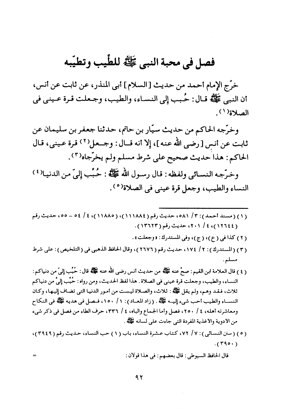 قال العلامة ابن القيم: صحّ عنه صلى اللَّه عليه وسلم من حديث أنس رضى اللَّه عنه صلى اللَّه عليه وسلم قال: حبّب إليّ من دنياكم: