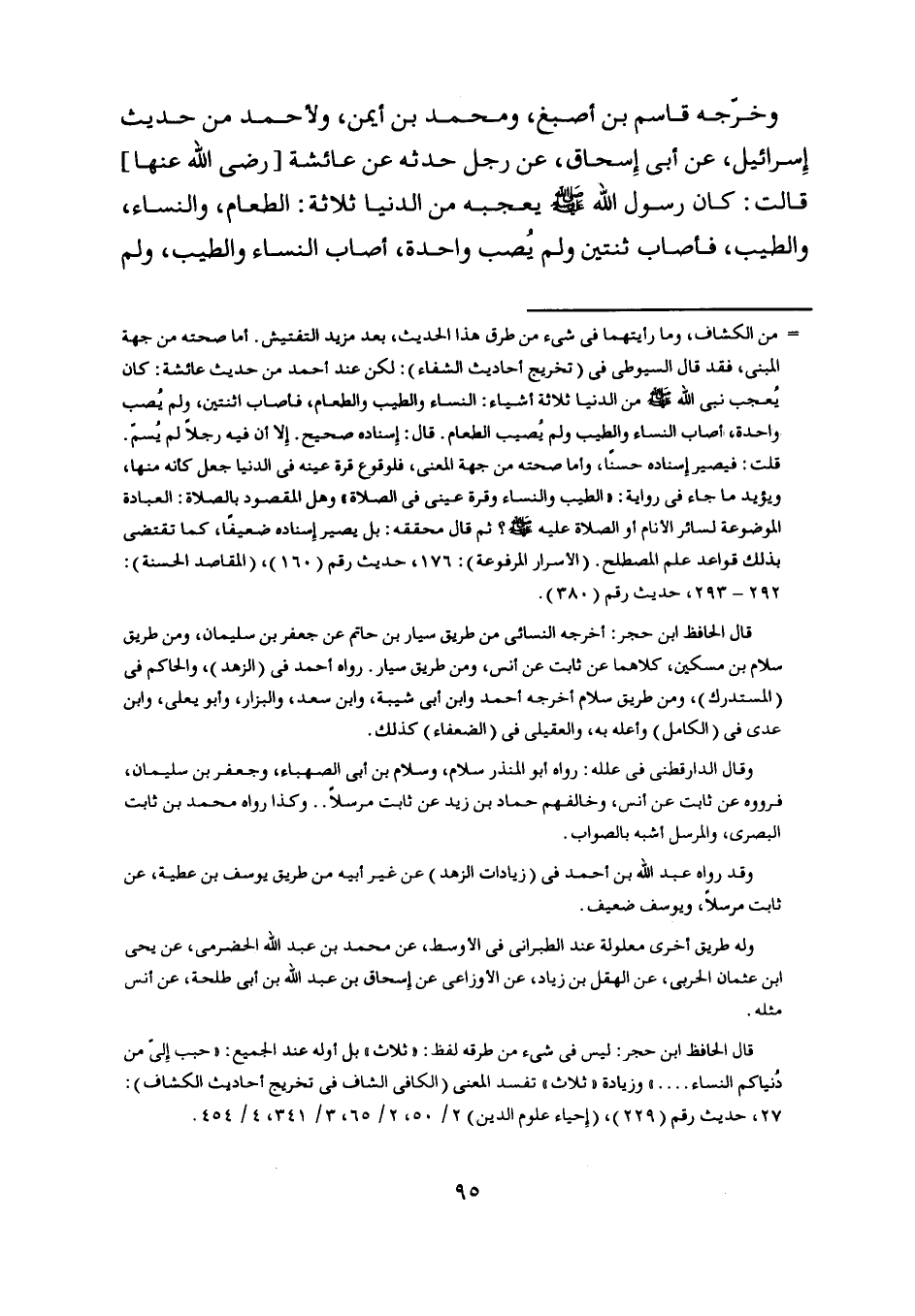 قال الحافظ ابن حجر: ليس في شيء من طرقه لفظ: «ثلاث» بل أوله عند الجميع: «حبب إليّ من دنياكم النساء ... » وزيادة «ثلاث» تفسد المعنى (الكافي الشاف في تخريج أحاديث الكشاف) :