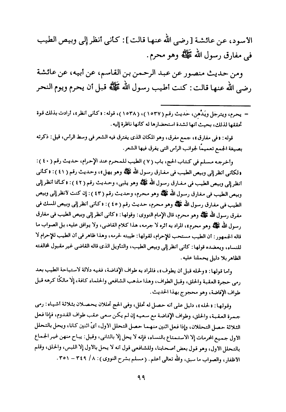 «لكأنّي انظر إلى وبيص الطيب في مفارق رسول اللَّه صلى اللَّه عليه وسلم وهو يهل» ، وحديث رقم (41) : «كأنى انظر إلى وبيص الطيب في مفارق رسول اللَّه صلى اللَّه عليه وسلم وهو يلبى، وحديث رقم (42) : «كأنما انظر إلى وبيص الطيب في مفارق رسول اللَّه صلى اللَّه عليه وسلم وهو محرم، وحديث رقم (43) : إن كنت لأنظر إلى وبيص الطيب في مفارق رسول اللَّه صلى اللَّه عليه وسلم وهو محرم، حديث رقم (45) : «كأنى انظر إلى وبيص المسك في مفرق رسول اللَّه صلى اللَّه عليه وسلم وهو محرم، قال الإمام النووي: وقولها: «كأنى انظر إلى وبيص الطيب في مفارق رسول اللَّه صلى اللَّه عليه وسلم وهو محرم» ، المراد به أثره لا جرمه، هذا كلام القاضي، ولا يوافق عليه، بل الصواب ما قاله الجمهور: أن الطيب مستحب للإحرام، لقولها: طيبته لحرمة، وهذا ظاهر في أن الطيب للإحرام لا للنساء، ويعضده قولها: كأنى انظر إلى وبيص الطيب، والتأويل الّذي قاله القاضي غير مقبول لمخالفته الظاهر بلا دليل يحملنا عليه.