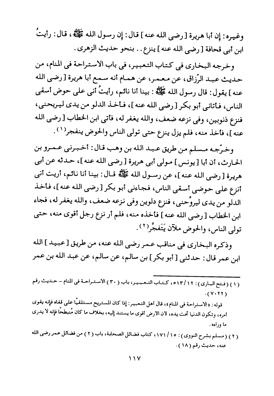 وخرجه البخاري في كتاب التعبير، في باب الاستراحة في المنام، من حديث عبد الرّزاق، عن معمر، عن همام أنه سمع أبا هريرة [رضى اللَّه عنه] يقول: قال رسول اللَّه صلّى اللَّه عليه وسلّم: بينا أنا نائم، رأيت أنى على حوض أسقى الناس، فأتانى أبو بكر [رضى اللَّه عنه] ، فأخذ الدلو من يدي ليريحنى، فنزع ذنوبين، وفي نزعه ضعف، واللَّه يغفر له، فأتى ابن الخطاب [رضى اللَّه عنه] ، فأخذ منه، فلم يزل ينزع حتى تولى الناس والحوض ينفجر [ (1) ] .