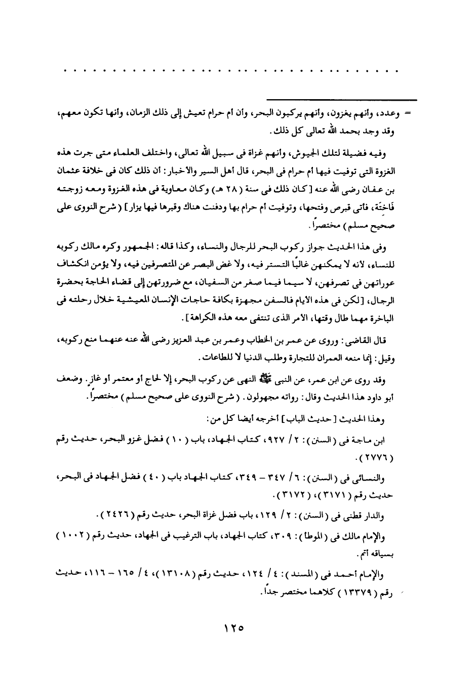 وقد روى عن ابن عمر، عن النبي صلّى اللَّه عليه وسلّم النهى عن ركوب البحر، إلا لحاج أو معتمر أو غاز. وضعف أبو داود هذا الحديث وقال: رواته مجهولون. (شرح النووي على صحيح مسلم) مختصرا.