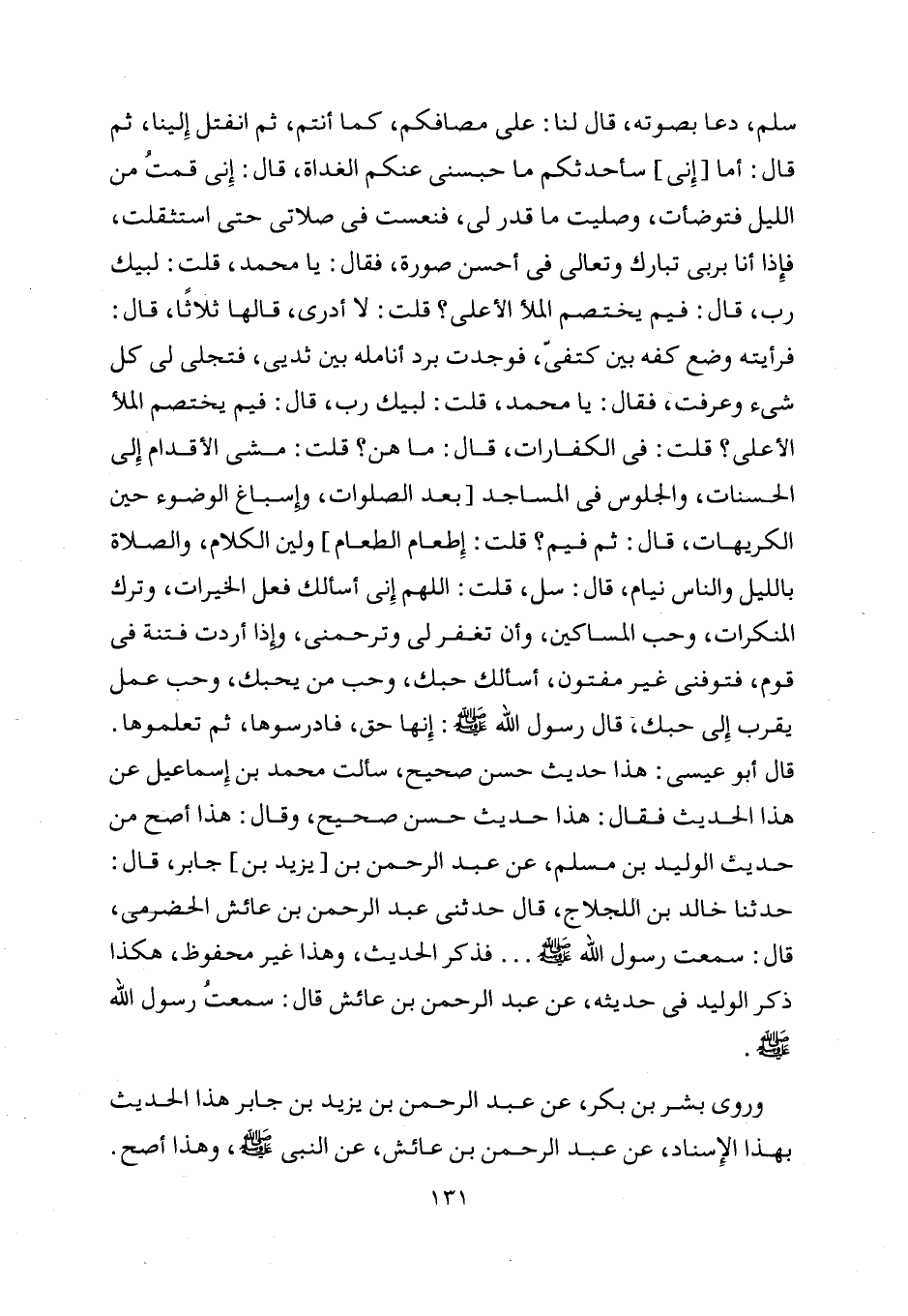 فرأيته وضع كفه بين كتفىّ، فوجدت برد أنامله بين ثديي، فتجلى لي كل شيء وعرفت، فقال: يا محمد، قلت: لبيك رب، قال: فيم يختصم الملأ الأعلى؟ قلت: في الكفارات، قال: ما هن؟ قلت: مشى الأقدام إلى الحسنات، والجلوس في المساجد [بعد الصلوات، وإسباغ الوضوء حين الكريهات، قال: ثم فيم؟ قلت: إطعام الطعام] ولين الكلام، والصلاة بالليل والناس نيام، قال: سل، قلت: اللَّهمّ إني أسألك فعل الخيرات، وترك المنكرات، وحب المساكين، وأن تغفر لي وترحمني، وإذا أردت فتنة في قوم، فتوفني غير مفتون، أسألك حبك، وحب من يحبك، وحب عمل يقرب إلى حبك، قال رسول اللَّه صلّى اللَّه عليه وسلّم: إنها حق، فادرسوها، ثم تعلموها.