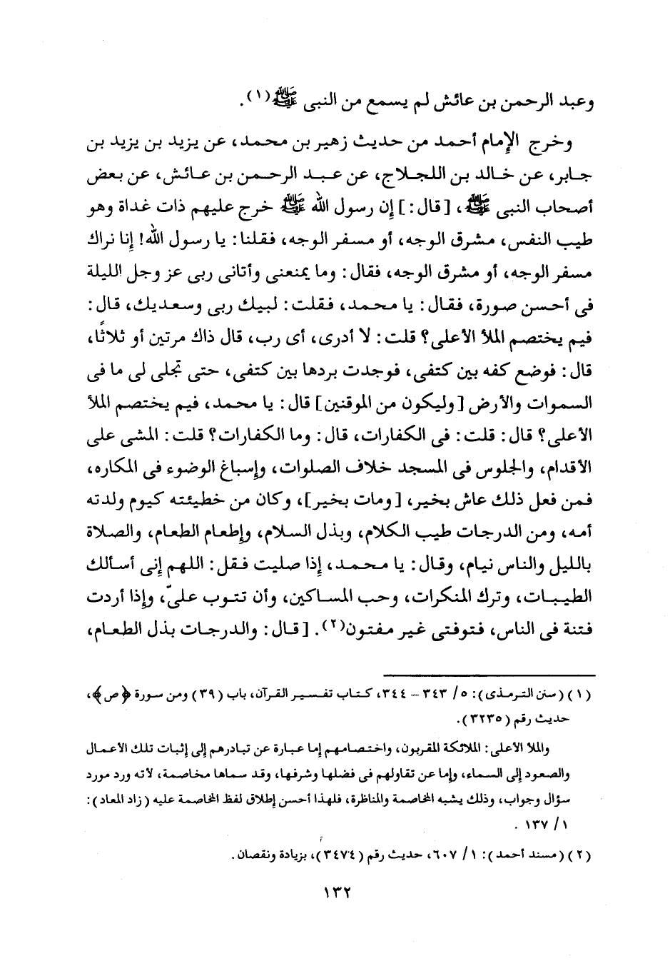 وخرج الإمام أحمد من حديث زهير بن محمد، عن يزيد بن يزيد بن جابر، عن خالد بن اللجلاج، عن عبد الرحمن بن عائش، عن بعض أصحاب النبي صلّى اللَّه عليه وسلّم، [قال:] إن رسول اللَّه صلّى اللَّه عليه وسلّم خرج عليهم ذات غداة وهو طيب النفس، مشرق الوجه، أو مسفر الوجه، فقلنا: يا رسول اللَّه! إنا نراك مسفر الوجه، أو مشرق الوجه، فقال: وما يمنعني وأتانى ربى عز وجل الليلة في أحسن صورة، فقال: يا محمد، فقلت: لبيك ربى وسعديك، قال: