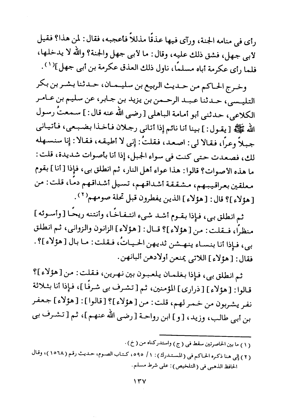 وخرج الحاكم من حديث الربيع بن سليمان، حدثنا بشر بن بكر التنيسي، حدثنا عبد الرحمن بن يزيد بن جابر، عن سليم بن عامر الكلاعي، حدثني أبو أمامة الباهلي [رضى اللَّه عنه قال:] سمعت رسول اللَّه صلّى اللَّه عليه وسلّم [يقول:] بينا أنا نائم إذا أتانى رجلان فأخذا بضبعي، فأتيانى جبلا وعرا، فقالا لي: اصعد، فقلت: إني لا أطيقه، فقالا: إنا سنسهله لك، فصعدت حتى كنت في سواء الجبل، إذا أنا بأصوات شديدة، قلت: