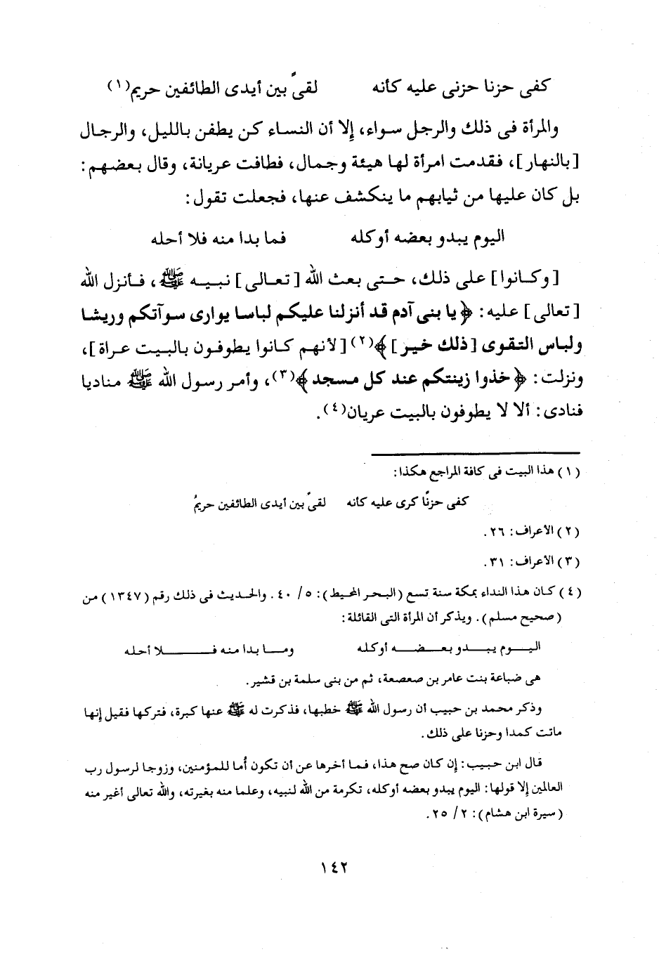 [وكانوا] على ذلك، حتى بعث اللَّه [تعالى] نبيه صلّى اللَّه عليه وسلّم، فأنزل اللَّه [تعالى] عليه: يا بَنِي آدَمَ قَدْ أَنْزَلْنا عَلَيْكُمْ لِباساً يُوارِي سَوْآتِكُمْ وَرِيشاً وَلِباسُ التَّقْوى [ذلِكَ خَيْرٌ] [ (2) ] [لأنهم كانوا يطوفون بالبيت عراة] ، ونزلت: خُذُوا زِينَتَكُمْ عِنْدَ كُلِّ مَسْجِدٍ [ (3) ] ، وأمر رسول اللَّه صلّى اللَّه عليه وسلّم مناديا فنادى: ألا لا يطوفون بالبيت عريان [ (4) ] .
