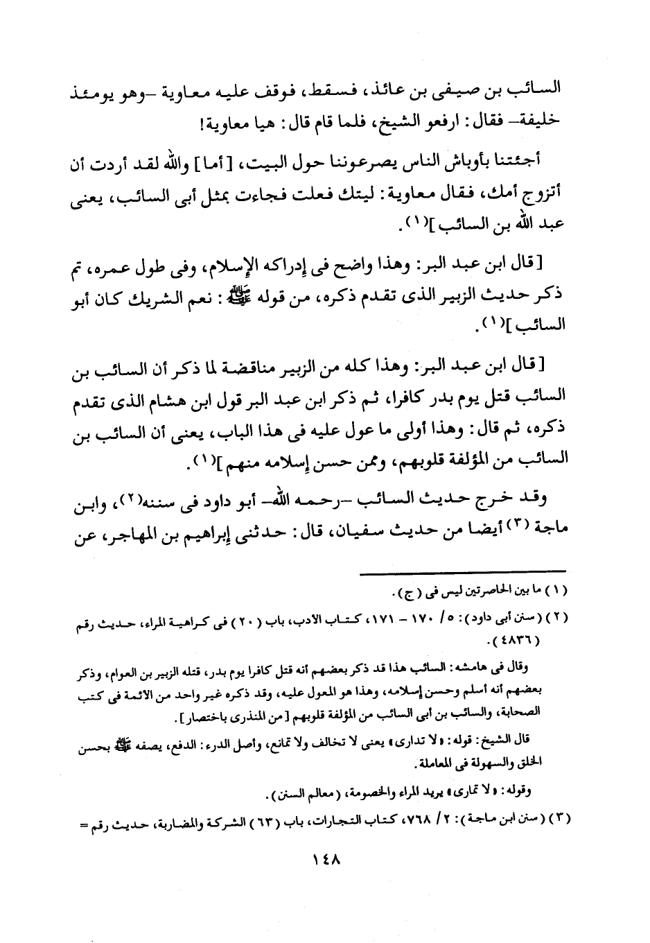 وقال في هامشه: السائب هذا قد ذكر بعضهم أنه قتل كافرا يوم بدر، قتله الزبير بن العوام، وذكر بعضهم أنه أسلم وحسن إسلامه، وهذا هو المعول عليه، وقد ذكره غير واحد من الأئمة في كتب الصحابة، والسائب بن أبى السائب من المؤلفة قلوبهم [من المنذري باختصار] .