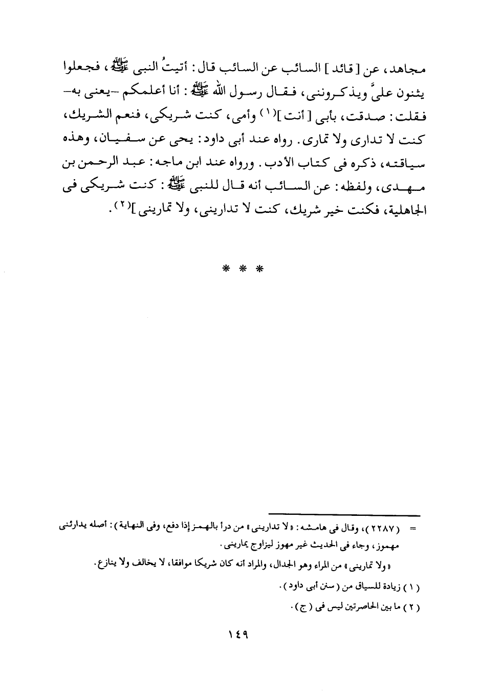 مجاهد، عن [قائد] السائب عن السائب قال: أتيت النبي صلّى اللَّه عليه وسلّم، فجعلوا يثنون عليّ ويذكرونني، فقال رسول اللَّه صلّى اللَّه عليه وسلّم: أنا أعلمكم- يعنى به- فقلت: صدقت، بأبي [أنت] [ (1) ] وأمى، كنت شريكي، فنعم الشريك، كنت لا تدارى ولا تمارى. رواه عند أبى داود: يحيى عن سفيان، وهذه سياقته، ذكره في كتاب الأدب. ورواه عند ابن ماجة: عبد الرحمن بن مهدي، ولفظه: عن السائب أنه قال للنّبيّ صلّى اللَّه عليه وسلّم: كنت شريكي في الجاهلية، فكنت خير شريك، كنت لا تدارينى، ولا تمارينى] [ (2) ] .
