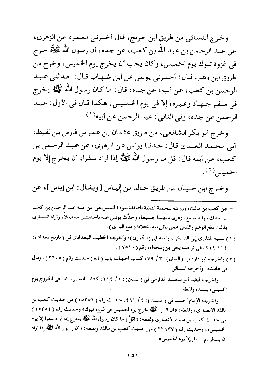 وخرج النسائي من طريق ابن جريج، قال أخبرنى معمر، عن الزهري، عن عبد الرحمن بن عبد اللَّه بن كعب، عن جده، أن رسول اللَّه صلّى اللَّه عليه وسلّم خرج في غزوة تبوك يوم الخميس، وكان يحب أن يخرج يوم الخميس، وخرج من طريق ابن وهب قال: أخبرنى يونس عن ابن شهاب قال: حدثني عبد الرحمن بن كعب، عن أبيه، عن جده، قال: ما كان رسول اللَّه صلّى اللَّه عليه وسلّم يخرج في سفر جهاد وغيره، إلا في يوم الخميس. هكذا قال في الأول: عبد الرحمن عن جده، وفي الثاني: عبد الرحمن عن أبيه [ (1) ] .
