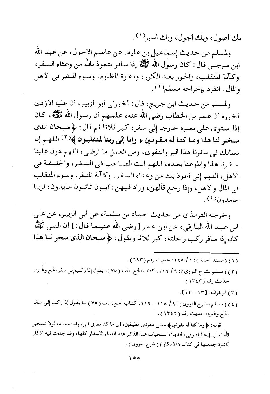 ولمسلم من حديث ابن جريج، قال: أخبرنى أبو الزبير، أن عليا الأزدي أخبره أن عمر بن الخطاب رضى اللَّه عنه، علمهم أن رسول اللَّه صلّى اللَّه عليه وسلّم، كان إذا استوى على بعيره خارجا إلى سفر، كبر ثلاثا ثم قال: سُبْحانَ الَّذِي سَخَّرَ لَنا هذا وَما كُنَّا لَهُ مُقْرِنِينَ* وَإِنَّا إِلى رَبِّنا لَمُنْقَلِبُونَ [ (3) ] اللَّهمّ إنا نسألك في سفرنا هذا البر والتقوى، ومن العمل ما ترضى، اللَّهمّ هون علينا سفرنا هذا واطو عنا بعده، اللَّهمّ أنت الصاحب في السفر، والخليفة في الأهل، اللَّهمّ إني أعوذ بك من وعثاء السفر، وكآبة المنظر، وسوء المنقلب في المال والأهل، وإذا رجع قالهن، وزاد فيهن: آئبون تائبون عابدون، لربنا حامدون [ (4) ] .