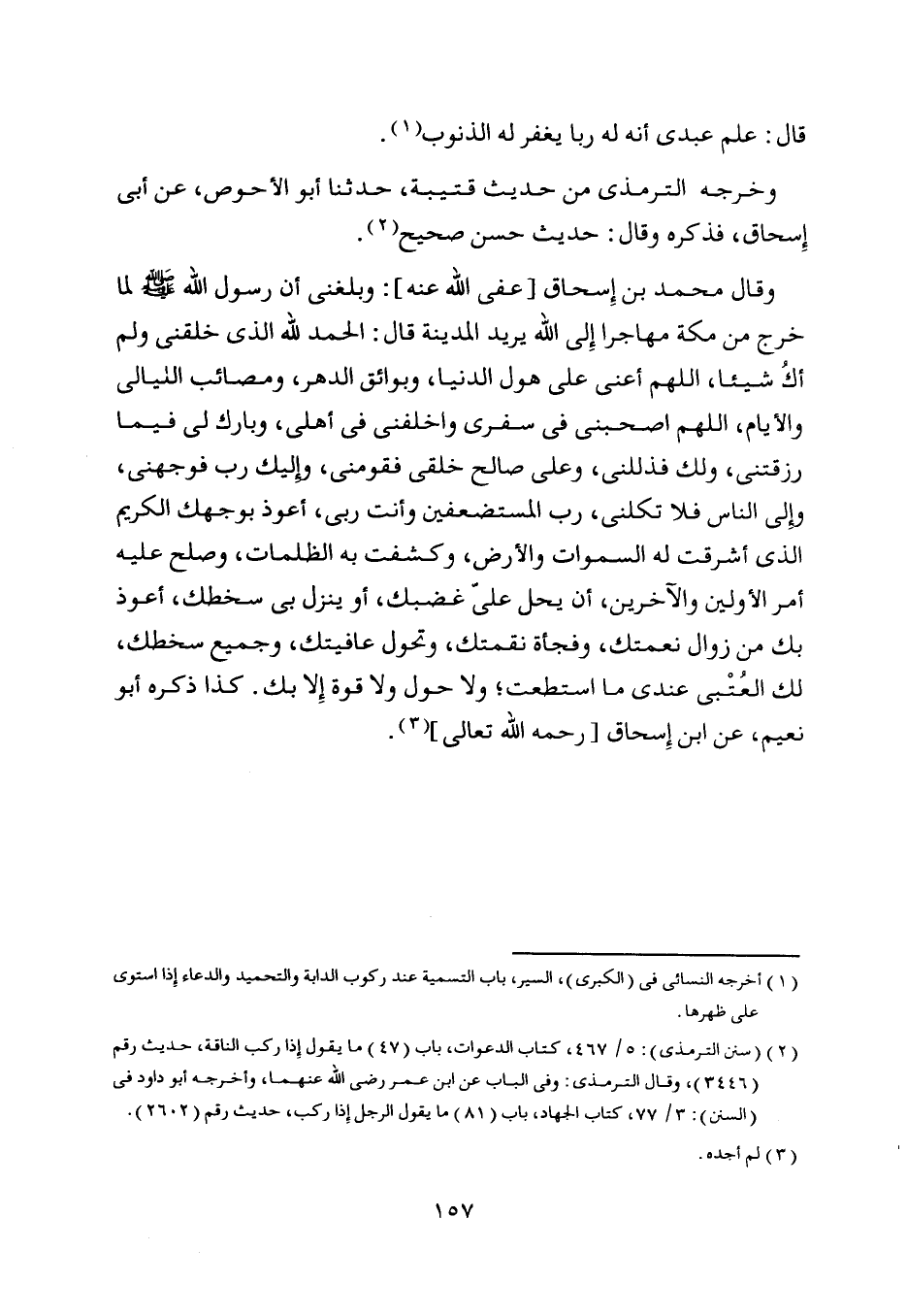 وقال محمد بن إسحاق [عفى اللَّه عنه] : وبلغني أن رسول اللَّه صلّى اللَّه عليه وسلّم لما خرج من مكة مهاجرا إلى اللَّه يريد المدينة قال: الحمد للَّه الّذي خلقني ولم أك شيئا، اللَّهمّ أعنى على هول الدنيا، وبوائق الدهر، ومصائب الليالي والأيام، اللَّهمّ اصحبنى في سفري واخلفني في أهلي، وبارك لي فيما رزقتني، ولك فذللني، وعلى صالح خلقي فقومني، وإليك رب فوجهني، وإلى الناس فلا تكلني، رب المستضعفين وأنت ربى، أعوذ بوجهك الكريم الّذي أشرقت له السموات والأرض، وكشفت به الظلمات، وصلح عليه أمر الأولين والآخرين، أن يحل عليّ غضبك، أو ينزل بى سخطك، أعوذ بك من زوال نعمتك، وفجأة نقمتك، وتحول عافيتك، وجميع سخطك، لك العتبى عندي ما استطعت، ولا حول ولا قوة إلا بك. كذا ذكره أبو نعيم، عن ابن إسحاق [رحمه اللَّه تعالى] [ (3) ] .