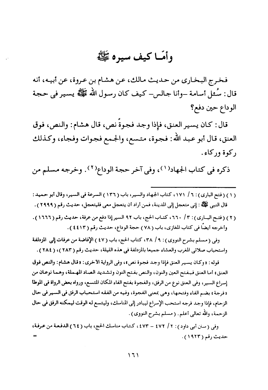 فخرج البخاري من حديث مالك، عن هشام بن عروة، عن أبيه، أنه قال: سئل أسامة- وأنا جالس- كيف كان رسول اللَّه صلّى اللَّه عليه وسلّم يسير في حجة الوداع حين دفع؟