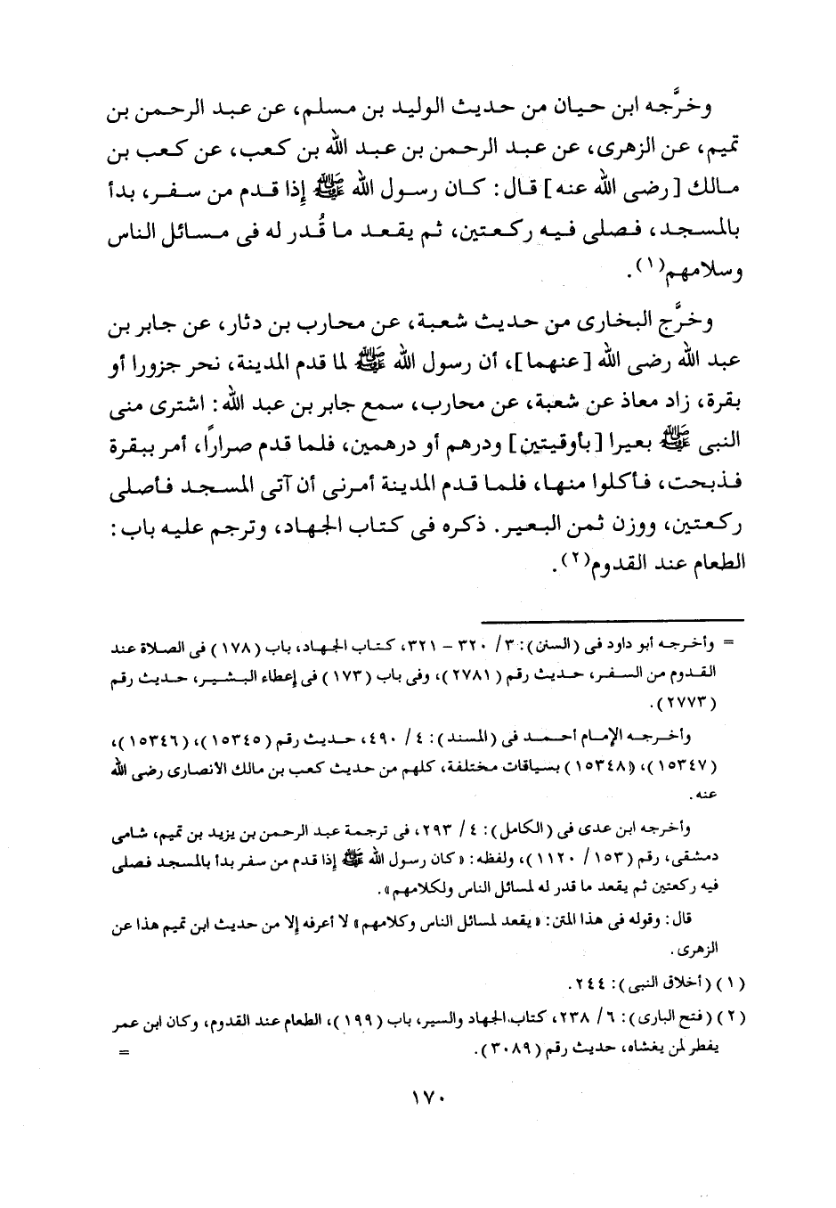 وخرّجه ابن حيان من حديث الوليد بن مسلم، عن عبد الرحمن بن تميم، عن الزهري، عن عبد الرحمن بن عبد اللَّه بن كعب، عن كعب بن مالك [رضى اللَّه عنه] قال: كان رسول اللَّه صلّى اللَّه عليه وسلّم إذا قدم من سفر، بدأ بالمسجد، فصلى فيه ركعتين، ثم يقعد ما قدر له في مسائل الناس وسلامهم [ (1) ] .