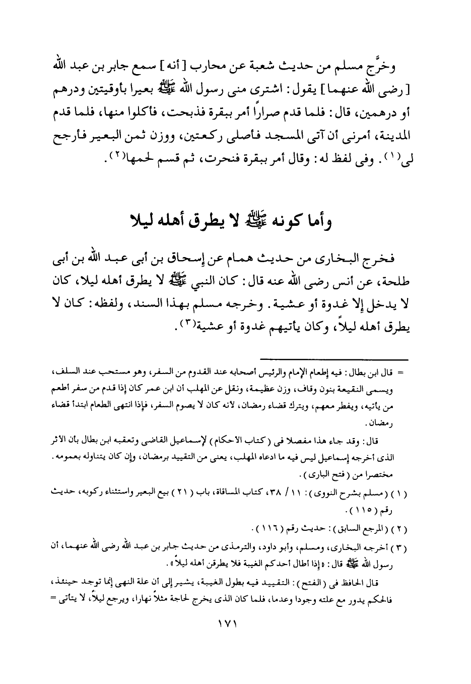 وخرّج مسلم من حديث شعبة عن محارب [أنه] سمع جابر بن عبد اللَّه [رضى اللَّه عنهما] يقول: اشترى منى رسول اللَّه صلّى اللَّه عليه وسلّم بعيرا بأوقيتين ودرهم أو درهمين، قال: فلما قدم صرارا أمر ببقرة فذبحت، فأكلوا منها، فلما قدم المدينة، أمرنى أن آتى المسجد فأصلى ركعتين، ووزن ثمن البعير فأرجح لي [ (1) ] . وفي لفظ له: وقال أمر ببقرة فنحرت، ثم قسم لحمها [ (2) ] .
