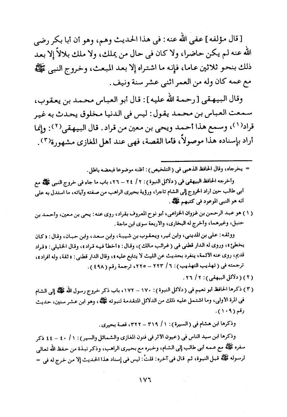 وأخرجه الحافظ البيهقي في (دلائل النبوة) : 2/ 24- 26، باب ما جاء في خروج النبي صلّى اللَّه عليه وسلّم مع أبى طالب حين أراد الخروج إلى الشام تاجرا، ورؤية بحيرى الراهب من صفته وآياته، ما استدل به على أنه هو النبي الموعود في كتبهم صلّى اللَّه عليه وسلّم.