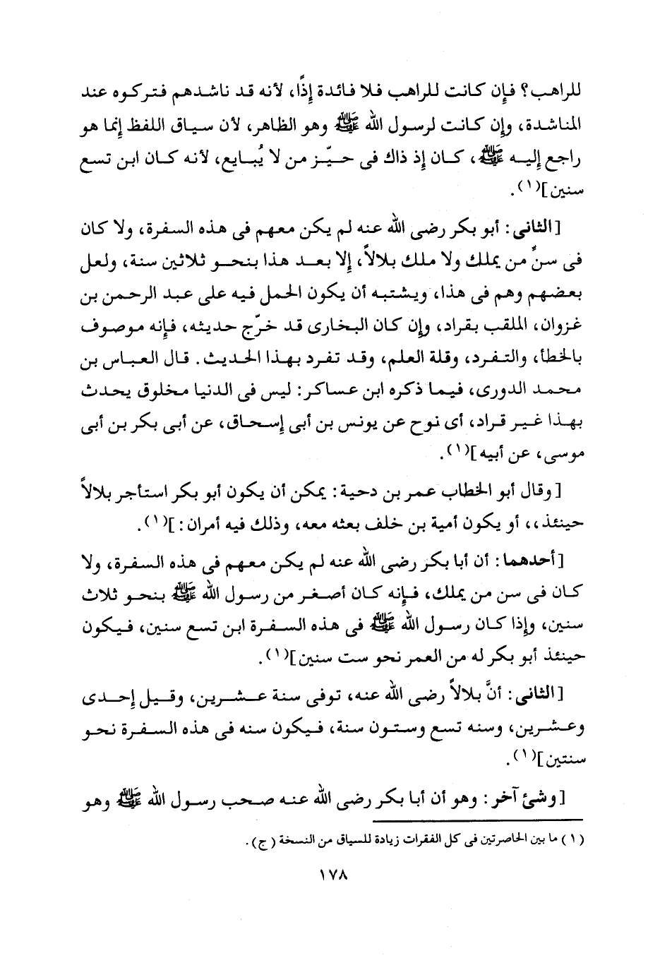 [الثاني: أبو بكر رضى اللَّه عنه لم يكن معهم في هذه السفرة، ولا كان في سنّ من يملك ولا ملك بلالا، إلا بعد هذا بنحو ثلاثين سنة، ولعل بعضهم وهم في هذا، ويشتبه أن يكون الحمل فيه على عبد الرحمن بن غزوان، الملقب بقراد، وإن كان البخاري قد خرّج حديثه، فإنه موصوف بالخطإ، والتفرد، وقلة العلم، وقد تفرد بهذا الحديث. قال العباس بن محمد الدوري، فيما ذكره ابن عساكر: ليس في الدنيا مخلوق يحدث بهذا غير قراد، أي نوح عن يونس بن أبى إسحاق، عن أبى بكر بن أبى موسى، عن أبيه] [ (1) ] .