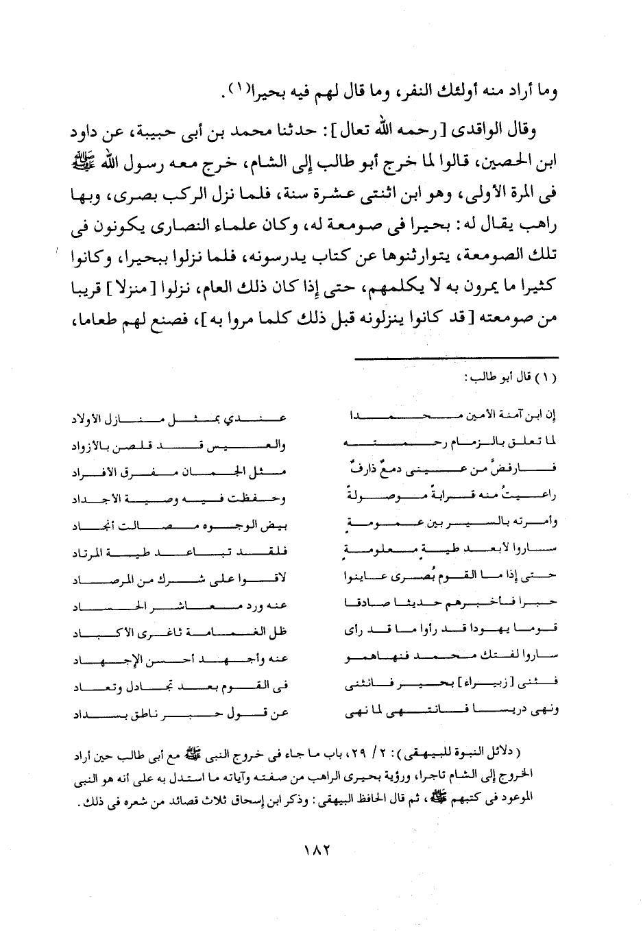 (دلائل النبوة للبيهقي) : 2/ 29، باب ما جاء في خروج النبي صلّى اللَّه عليه وسلّم مع أبى طالب حين أراد الخروج إلى الشام تاجرا، ورؤية بحيرى الراهب من صفته وآياته ما استدل به على أنه هو النبي الموعود في كتبهم صلّى اللَّه عليه وسلّم، ثم قال الحافظ البيهقي: وذكر ابن إسحاق ثلاث قصائد من شعره في ذلك.