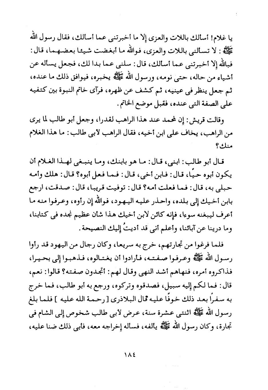 وقالت قريش: إن لمحمد عند هذا الراهب لقدرا، وجعل أبو طالب لما يرى من الراهب، يخاف على ابن أخيه، فقال الراهب لأبى طالب: ما هذا الغلام منك؟