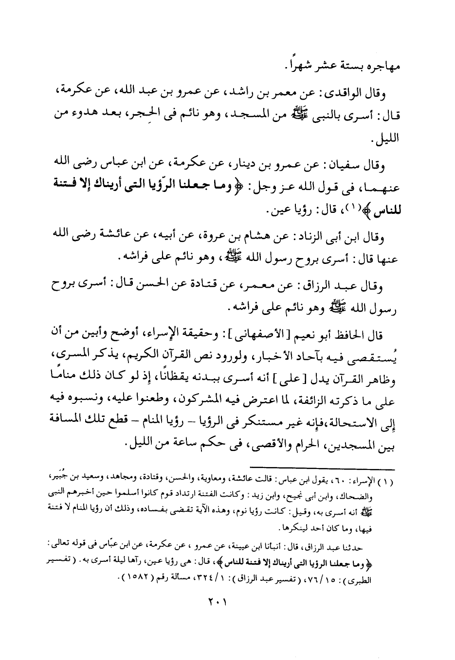 وَما جَعَلْنَا الرُّؤْيَا الَّتِي أَرَيْناكَ إِلَّا فِتْنَةً لِلنَّاسِ، قال: هي رؤيا عين، رآها ليلة أسرى به. (تفسير الطبري) : 15/ 76، (تفسير عبد الرزاق) : 1/ 324، مسألة رقم (1582) .