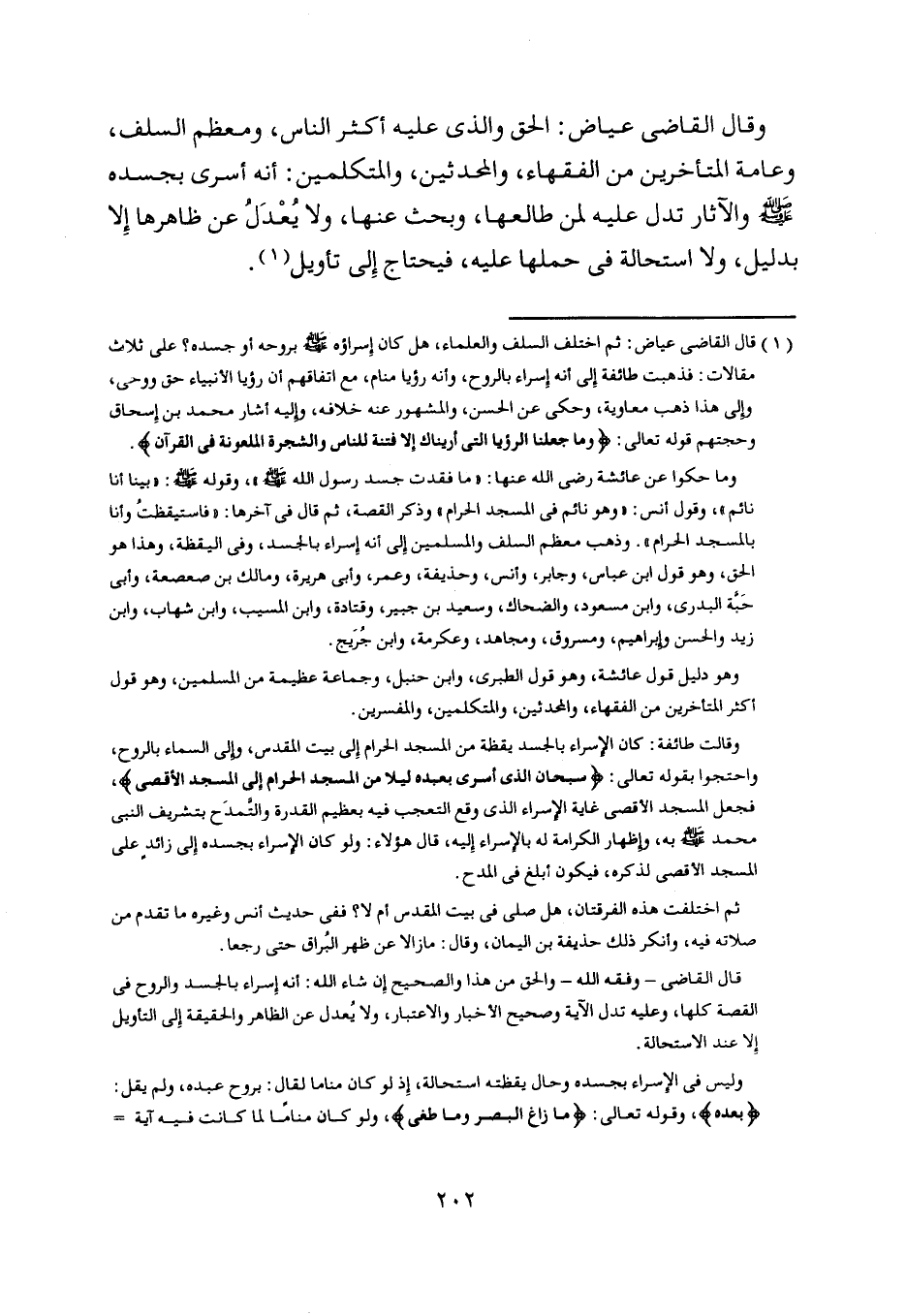 وقال القاضي عياض: الحق والّذي عليه أكثر الناس، ومعظم السلف، وعامة المتأخرين من الفقهاء، والمحدثين، والمتكلمين: أنه أسرى بجسده صلّى اللَّه عليه وسلّم والآثار تدل عليه لمن طالعها، وبحث عنها، ولا يعدل عن ظاهرها إلا بدليل، ولا استحالة في حملها عليه، فيحتاج إلى تأويل [ (1) ] .