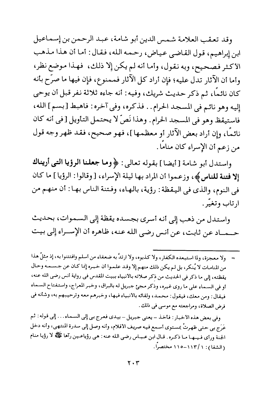 وقد تعقب العلامة شمس الدين أبو شامة، عبد الرحمن بن إسماعيل ابن إبراهيم، قول القاضي عياض، رحمه اللَّه، فقال: أما أن هذا مذهب الأكثر فصحيح، وبه نقول، وأما أنه لم يكن إلا ذلك، فهذا موضع نظر، وأما أن الآثار تدل عليه، فإن أراد كل الآثار فممنوع، فإن فيها ما صرّح بأنه كان نائما، ثم ذكر حديث شريك، وفيه: أنه جاءه ثلاثة نفر قبل أن يوحى إليه وهو نائم في المسجد الحرام ... فذكره، وفي آخره: فاهبط [بسم] اللَّه، فاستيقظ وهو في المسجد الحرام. وهذا نصّ لا يحتمل التأويل [في أنه كان نائما، وإن أراد بعض الآثار أو معظمها] ، فهو صحيح، فقد ظهر وجه قول من زعم أن الإسراء كان مناما.