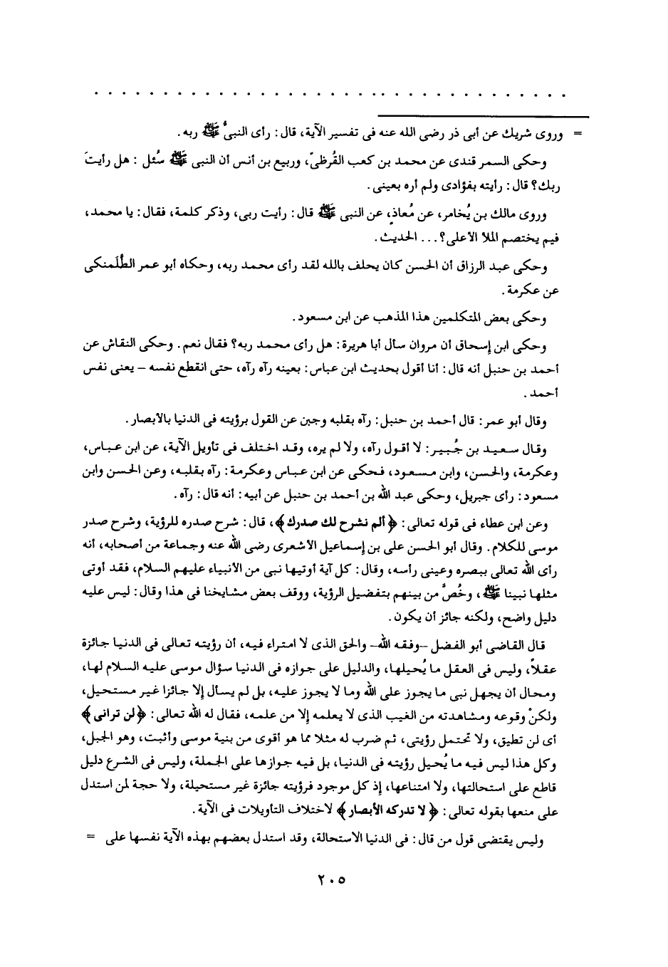 وعن ابن عطاء في قوله تعالى: أَلَمْ نَشْرَحْ لَكَ صَدْرَكَ، قال: شرح صدره للرؤية، وشرح صدر موسى للكلام. وقال أبو الحسن على بن إسماعيل الأشعري رضى اللَّه عنه وجماعة من أصحابه، أنه رأى اللَّه تعالى ببصره وعيني رأسه، وقال: كل آية أوتيها نبي من الأنبياء عليهم السلام، فقد أوتى مثلها نبينا صلّى اللَّه عليه وسلّم، وخصّ من بينهم بتفضيل الرؤية، ووقف بعض مشايخنا في هذا وقال: ليس عليه دليل واضح، ولكنه جائز أن يكون.