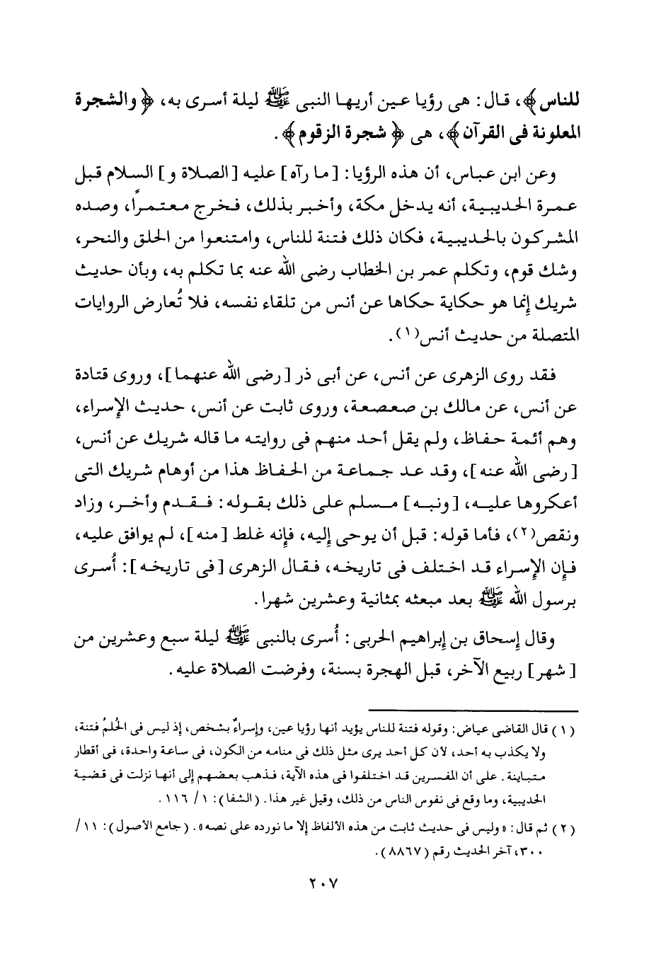 [ (1) ] قال القاضي عياض: وقوله فتنة للناس يؤيد أنها رؤيا عين، وإسراء بشخص، إذ ليس في الحلم فتنة، ولا يكذب به أحد، لأن كل أحد يرى مثل ذلك في منامه من الكون، في ساعة واحدة، في أقطار متباينة. على أن المفسرين قد اختلفوا في هذه الآية، فذهب بعضهم إلى أنها نزلت في قضية الحديبيّة، وما وقع في نفوس الناس من ذلك، وقيل غير هذا. (الشفا) : 1/ 116.