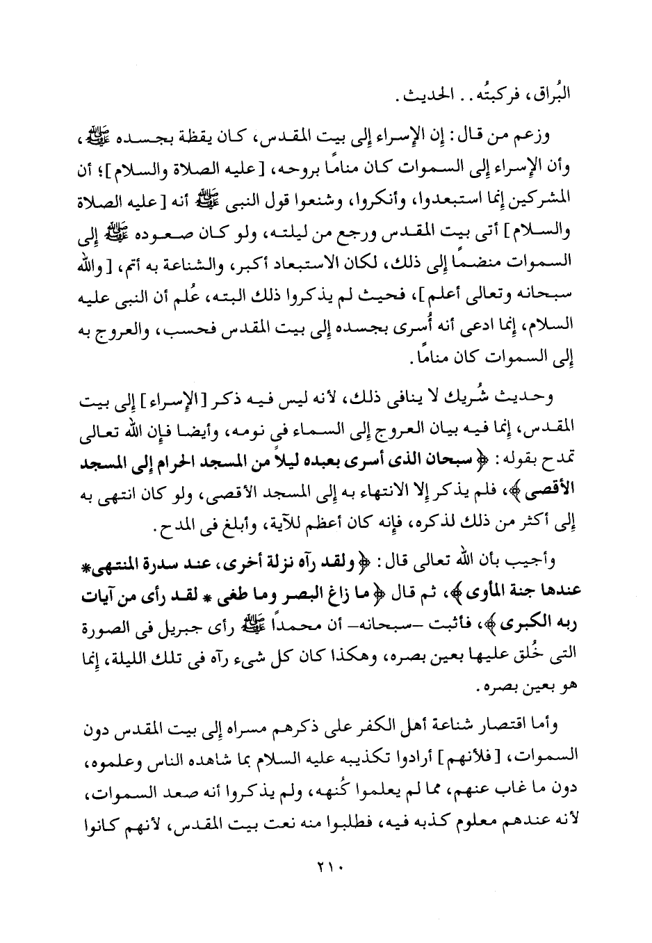 وزعم من قال: إن الإسراء إلى بيت المقدس، كان يقظة بجسده صلّى اللَّه عليه وسلّم، وأن الإسراء إلى السموات كان مناما بروحه، [عليه الصلاة والسلام] ، أن المشركين إنما استبعدوا، وأنكروا، وشنعوا قول النبي صلّى اللَّه عليه وسلّم أنه [عليه الصلاة والسلام] أتى بيت المقدس ورجع من ليلته، ولو كان صعوده صلّى اللَّه عليه وسلّم إلى السموات منضما إلى ذلك، لكان الاستبعاد أكبر، والشناعة به أتم، [واللَّه سبحانه وتعالى أعلم] ، فحيث لم يذكروا ذلك البتة، علم أن النبي عليه السلام، إنما ادعى أنه أسرى بجسده إلى بيت المقدس فحسب، والعروج به إلى السموات كان مناما.