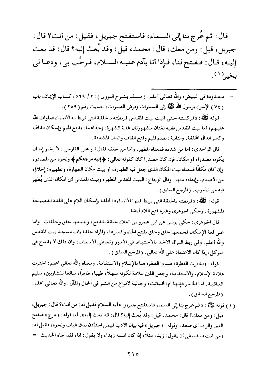 قال الجوهري: حكى يونس عن أبى عمرو بن العلاء حلقة بالفتح، وجمعها حلق وحلقات. وأما على لغة الإسكان فجمعها حلق وحلق بفتح الحاء وكسرها، والمراد حلقة باب مسجد بيت المقدس واللَّه أعلم. وفي ربط البراق الأخذ بالاحتياط في الأمور وتعاطى الأسباب، وأن ذلك لا يقدح في التوكل، إذا كان الاعتماد على اللَّه تعالى. (المرجع السابق) .