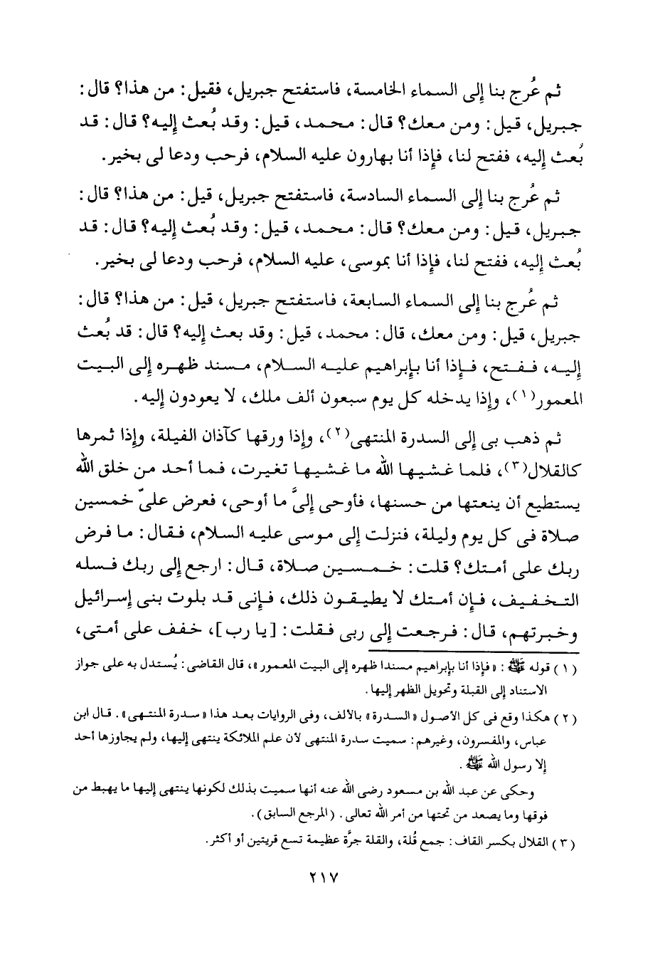 [ (2) ] هكذا وقع في كل الأصول «السدرة» بالألف، وفي الروايات بعد هذا «سدرة المنتهى» . قال ابن عباس، والمفسرون، وغيرهم: سميت سدرة المنتهى لأن علم الملائكة ينتهى إليها، ولم يجاوزها أحد إلا رسول اللَّه صلّى اللَّه عليه وسلّم.