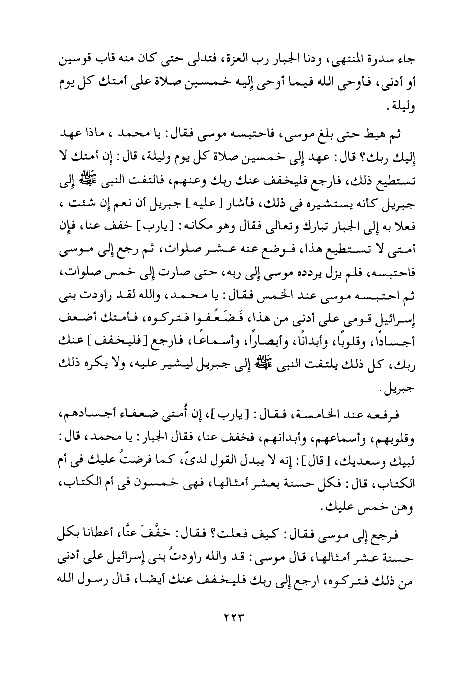 جاء سدرة المنتهى، ودنا الجبار رب العزة، فتدلى حتى كان منه قاب قوسين أو أدنى، فأوحى اللَّه فيما أوحى إليه خمسين صلاة على أمتك كل يوم وليلة.