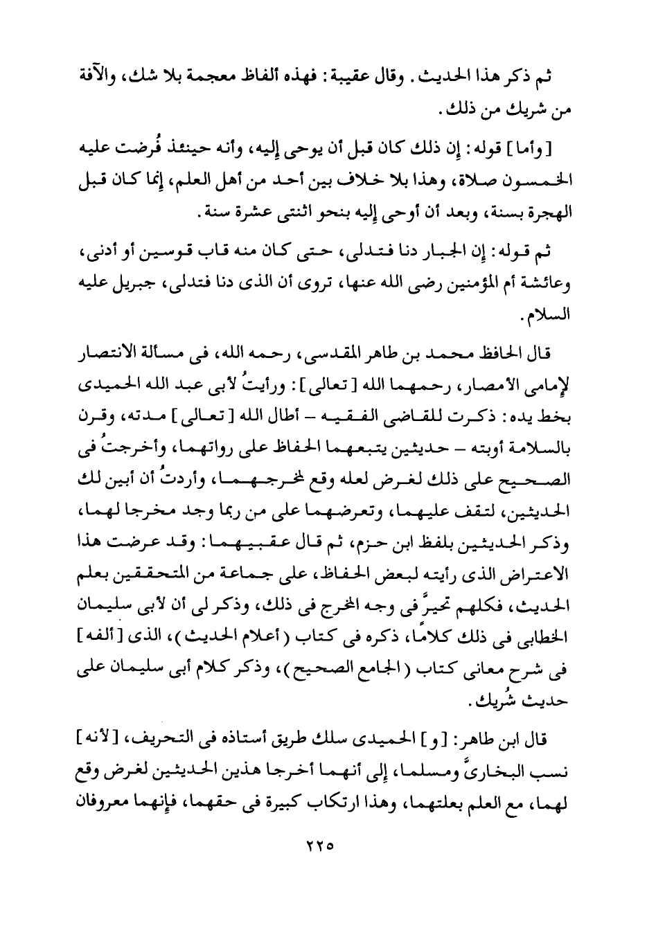 قال الحافظ محمد بن طاهر المقدسي، رحمه اللَّه، في مسألة الانتصار لإمامى الأمصار، رحمهما اللَّه [تعالى] : ورأيت لأبى عبد اللَّه الحميدي بخط يده: ذكرت للقاضي الفقيه- أطال اللَّه [تعالى] مدته، وقرن بالسلامة أوبته- حديثين يتبعهما الحافظ على رواتهما، وأخرجت في الصحيح على ذلك لغرض لعله وقع لمخرجهما، وأردت أن أبين لك الحديثين، لتقف عليهما، وتعرضهما على من ربما وجد مخرجا لهما، وذكر الحديثين بلفظ ابن حزم، ثم قال عقبيهما: وقد عرضت هذا الاعتراض الّذي رأيته لبعض الحفاظ، على جماعة من المتحققين بعلم الحديث، فكلهم تحيّر في وجه المخرج في ذلك، وذكر لي أن لأبى سليمان الخطابي في ذلك كلاما، ذكره في كتاب (أعلام الحديث) ، الّذي [ألفه] في شرح معاني كتاب (الجامع الصحيح) ، وذكر كلام أبى سليمان على حديث شريك.