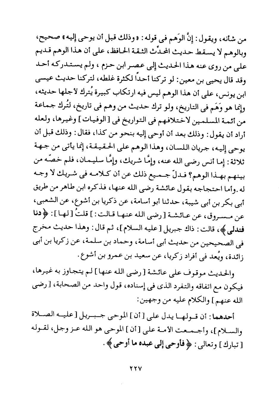 من شأنه، ويقول: إنّ الوهم في قوله: «وذلك قبل أن يوحى إليه» صحيح، وبالوهم لا يسقط حديث المحدّث الثقة الحافظ، على أن هذا الوهم قديم على من روى عنه هذا الحديث إلى عصر ابن حزم، ولم يستدركه أحد وقد قال يحيى بن معين: لو تركنا أحدا لكثرة غلطه، لتركنا حديث عيسى ابن يونس، على أن هذا الوهم ليس فيه ارتكاب كبيرة يترك لأجلها حديثه، وإنما هو وهم في التاريخ، ولو ترك حديث من وهم في تاريخ، لترك جماعة من أئمة المسلمين لاختلافهم في التواريخ في [الوفيات] وغيرها، ولعله أراد أن يقول: وذلك بعد أن أوحى إليه بنحو من كذا، فقال: وذلك قبل أن يوحى إليه، جريان اللسان، وهذا الوهم على الحقيقة، إنما يأتى من جهة ثلاثة: إما أنس رضى اللَّه عنه، وإمّا شريك، وإمّا سليمان، فلم خصّه من بينهم بهذا الوهم؟ فدلّ جميع ذلك عن أن كلامه في شريك لا وجه له. وأما احتجاجه بقول عائشة رضى اللَّه عنها، فذكره ابن طاهر من طريق أبى بكر بن أبى شيبة، حدثنا أبو أسامة، عن زكريا بن أشوع، عن الشعبي، عن مسروق، عن عائشة [رضى اللَّه عنها قالت:] قلت [لها] : دَنا فَتَدَلَّى، قالت: ذاك جبريل [عليه السلام] ، ثم قال: وهذا حديث مخرج في الصحيحين من حديث أبى أسامة، وحماد بن سلمة، عن زكريا بن أبى زائدة، ويعد في أفراد زكريا، عن سعيد بن عمرو بن أشوع.
