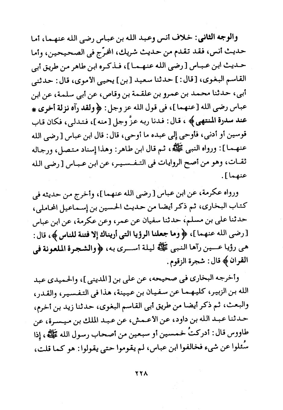 والوجه الثاني: خلاف أنس وعبد اللَّه بن عباس رضى اللَّه عنهما، أما حديث أنس، فقد تقدم من حديث شريك، المخرّج في الصحيحين، وأما حديث ابن عباس [رضى اللَّه عنهما] ، فذكره ابن طاهر من طريق أبى القاسم البغوي، [قال:] حدثنا سعيد [بن] يحيى الأموي، قال: حدثني أبى، حدثنا محمد بن عمرو بن علقمة بن وقاص، عن أبى سلمة، عن ابن عباس رضى اللَّه [عنهما] ، في قول اللَّه عز وجل: وَلَقَدْ رَآهُ نَزْلَةً أُخْرى * عِنْدَ سِدْرَةِ الْمُنْتَهى، قال: فدنا ربه عزّ وجل [منه] ، فتدلى، فكان قاب قوسين أو أدنى، فأوحى إلى عبده ما أوحى، قال: قال ابن عباس [رضى اللَّه عنهما] : ورواه النبي صلّى اللَّه عليه وسلّم، ثم قال ابن طاهر: وهذا إسناد متصل، ورجاله ثقات، وهو من أصح الروايات في التفسير، عن ابن عباس [رضى اللَّه عنهما] .