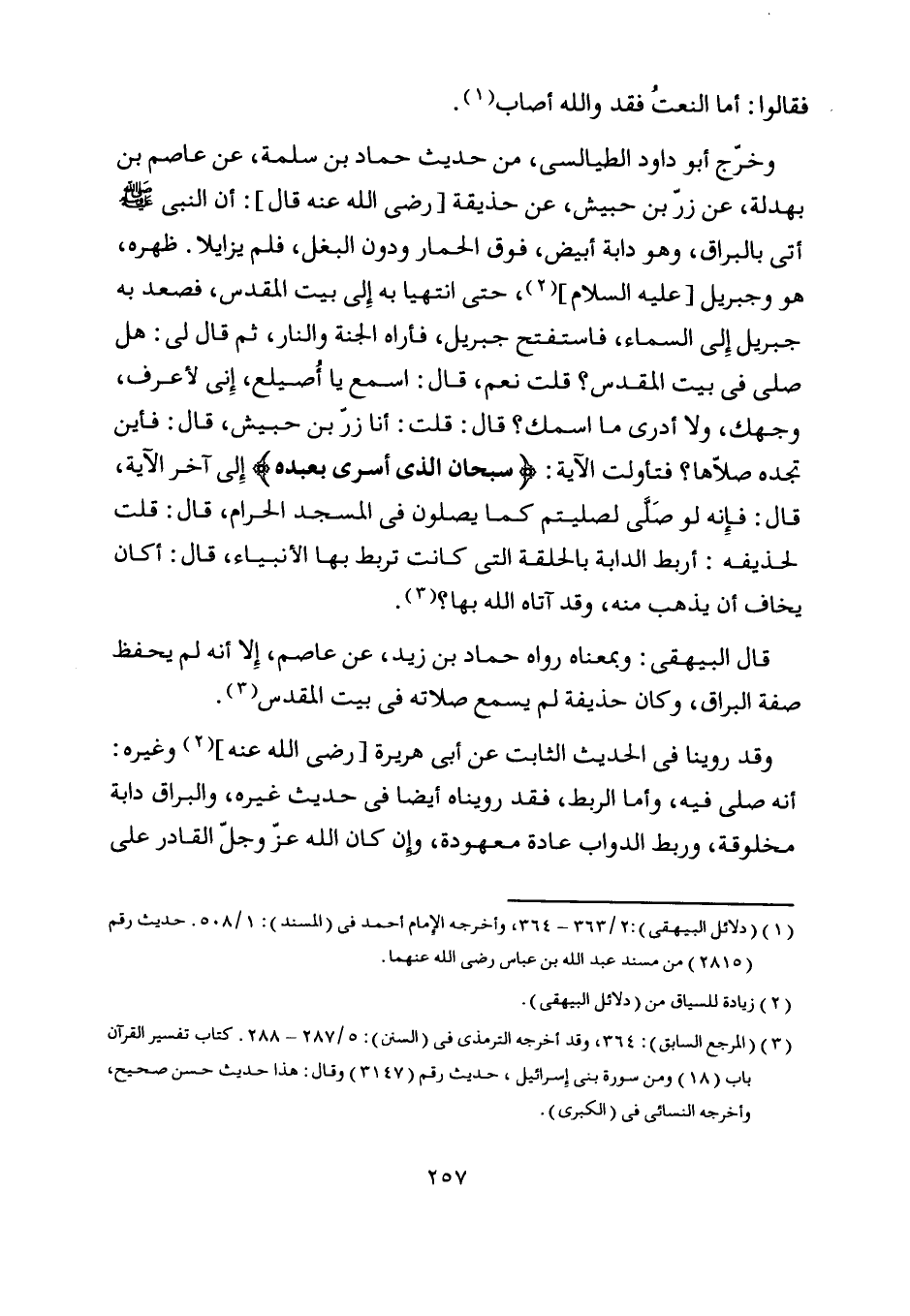 قال البيهقي: وبمعناه رواه حماد بن زيد، عن عاصم، إلا أنه لم يحفظ صفة البراق، وكان حذيفة لم يسمع صلاته في بيت المقدس [ (3) ] .