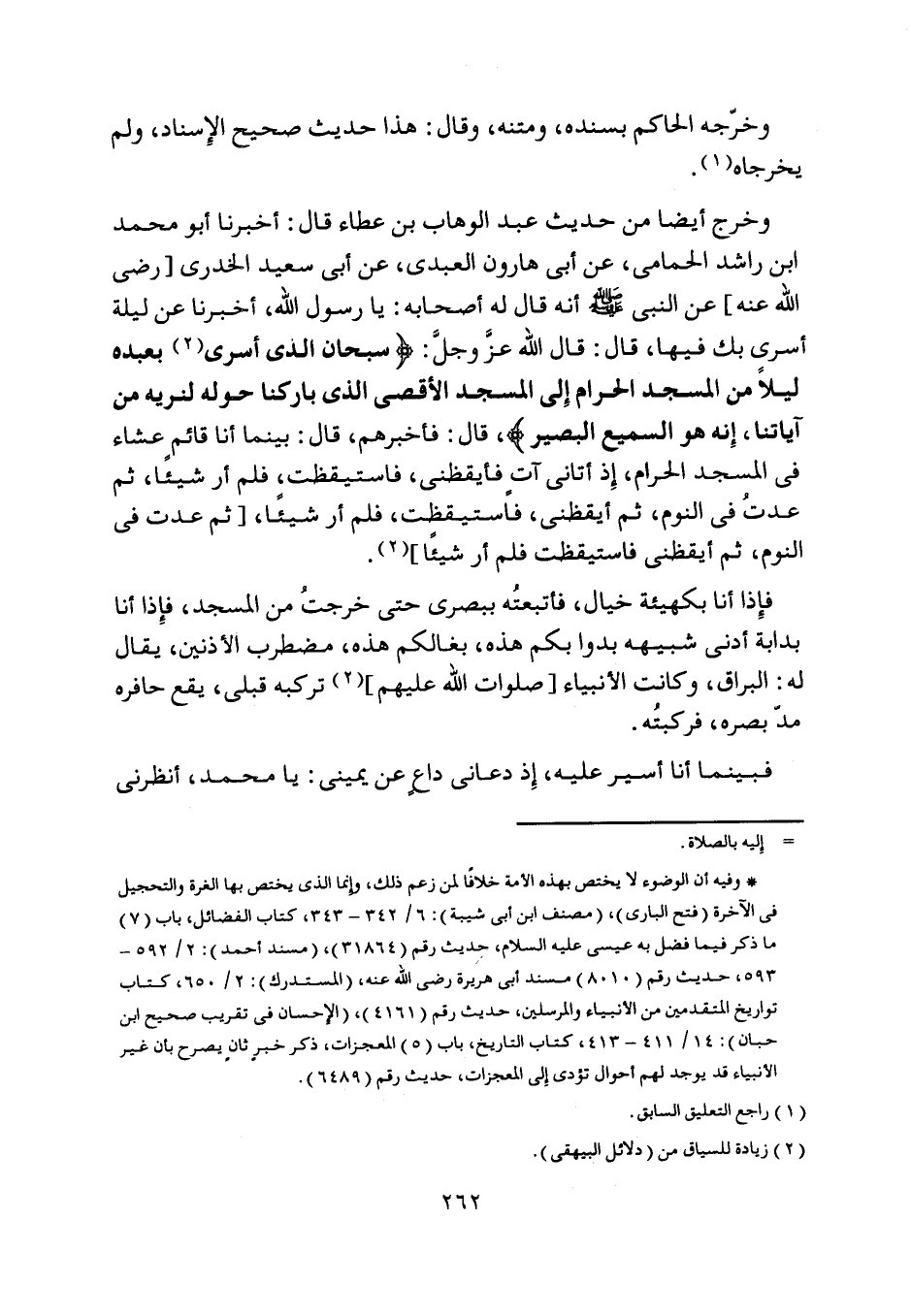 وخرج أيضا من حديث عبد الوهاب بن عطاء قال: أخبرنا أبو محمد ابن راشد الحمامي، عن أبى هارون العبديّ، عن أبى سعيد الخدريّ [رضى اللَّه عنه] عن النبي صلّى اللَّه عليه وسلّم أنه قال له أصحابه: يا رسول اللَّه، أخبرنا عن ليلة أسرى بك فيها، قال: قال اللَّه عزّ وجلّ: سُبْحانَ الَّذِي أَسْرى [ (2) ] بِعَبْدِهِ لَيْلًا مِنَ الْمَسْجِدِ الْحَرامِ إِلَى الْمَسْجِدِ الْأَقْصَى الَّذِي بارَكْنا حَوْلَهُ لِنُرِيَهُ مِنْ آياتِنا، إِنَّهُ هُوَ السَّمِيعُ الْبَصِيرُ، قال: فأخبرهم، قال: بينما أنا قائم عشاء في المسجد الحرام، إذ أتانى آت فأيقظنى، فاستيقظت، فلم أر شيئا، ثم عدت في النوم، ثم أيقظني، فاستيقظت، فلم أر شيئا، [ثم عدت في النوم، ثم أيقظني فاستيقظت فلم أر شيئا] [ (2) ] .