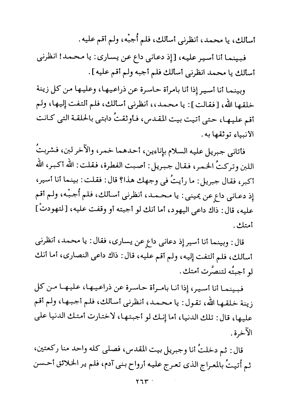 فأتانى جبريل عليه السلام بإناءين، أحدهما خمر، والآخر لبن، فشربت اللبن وتركت الخمر، فقال جبريل: أصبت الفطرة، فقلت: اللَّه أكبر، اللَّه أكبر، فقال جبريل: ما رأيت في وجهك هذا؟ قال: فقلت: بينما أنا أسير، إذ دعاني داع عن يميني: يا محمد، أنظرني أسألك، فلم أجبه، ولم أقم عليه، قال: ذاك داعي اليهود، أما أنك لو أجبته أو وقفت عليه، [لتهودت] أمتك.