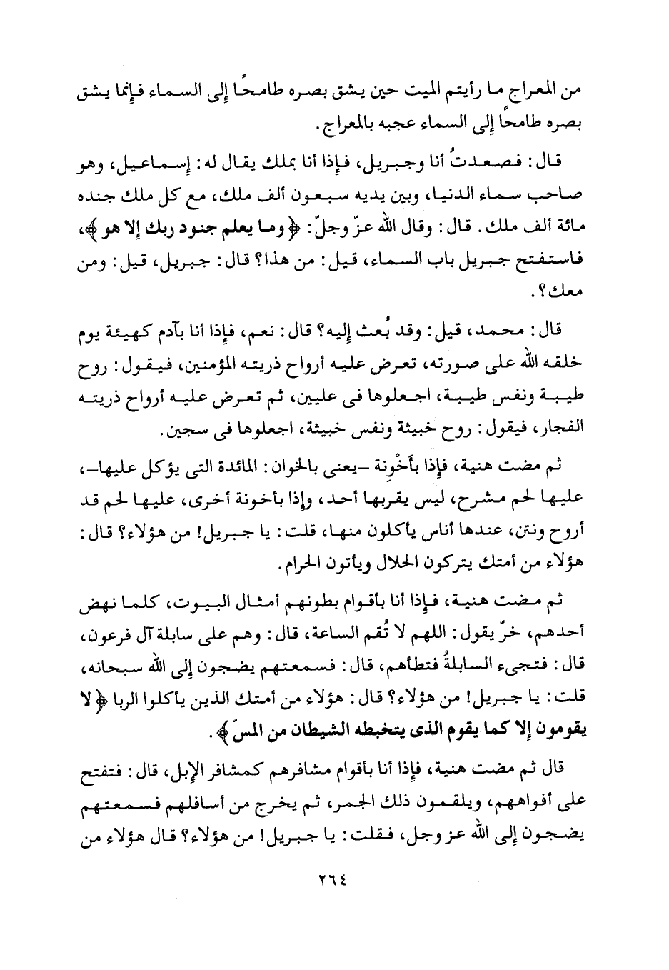 ثم مضت هنية، فإذا أنا بأقوام بطونهم أمثال البيوت، كلما نهض أحدهم، خرّ يقول: اللَّهمّ لا تقم الساعة، قال: وهم على سابلة آل فرعون، قال: فتجيء السابلة فتطؤهم، قال: فسمعتهم يضجون إلى اللَّه سبحانه، قلت: يا جبريل! من هؤلاء؟ قال: هؤلاء من أمتك الذين يأكلوا الربا لا يَقُومُونَ إِلَّا كَما يَقُومُ الَّذِي يَتَخَبَّطُهُ الشَّيْطانُ مِنَ الْمَسِّ.