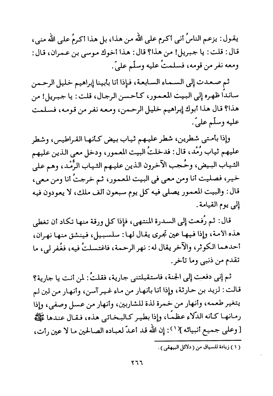 وإذا بأمتي شطرين، شطر عليهم ثياب بيض كأنها القراطيس، وشطر عليهم ثياب رمد، قال: فدخلت البيت المعمور، ودخل معى الذين عليهم الثياب البيض، وحجب الآخرون الذين عليهم الثياب الرّمد، وهم على خير، فصليت أنا ومن معى في البيت المعمور، ثم خرجت أنا ومن معى، قال: والبيت المعمور يصلى فيه كل يوم سبعون ألف ملك، لا يعودون فيه إلى يوم القيامة.